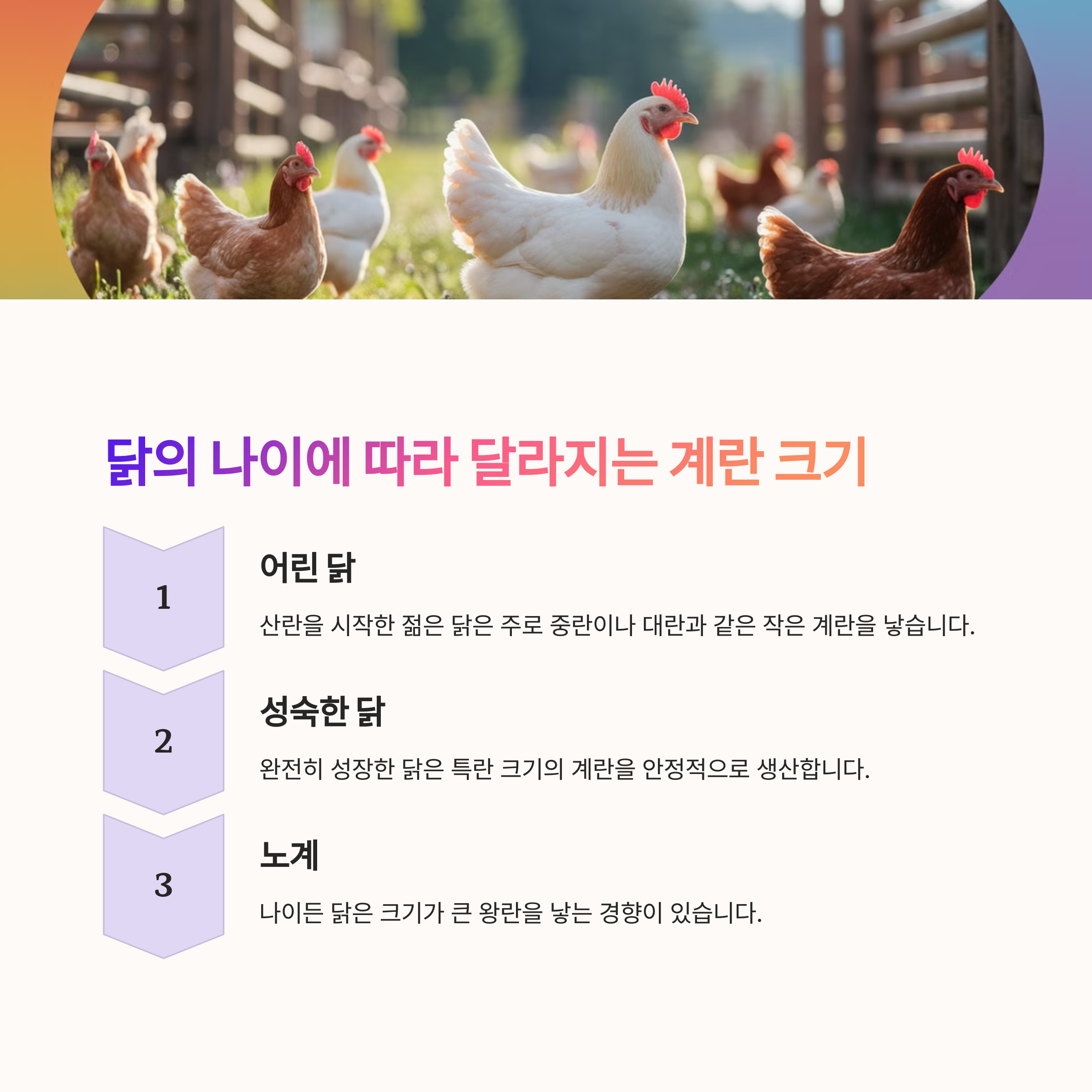 재밌는 사실! 계란의 크기는 닭의 나이와 밀접한 관련이 있어요. 닭도 나이를 먹을수록 더 큰 계란을 낳는답니다!