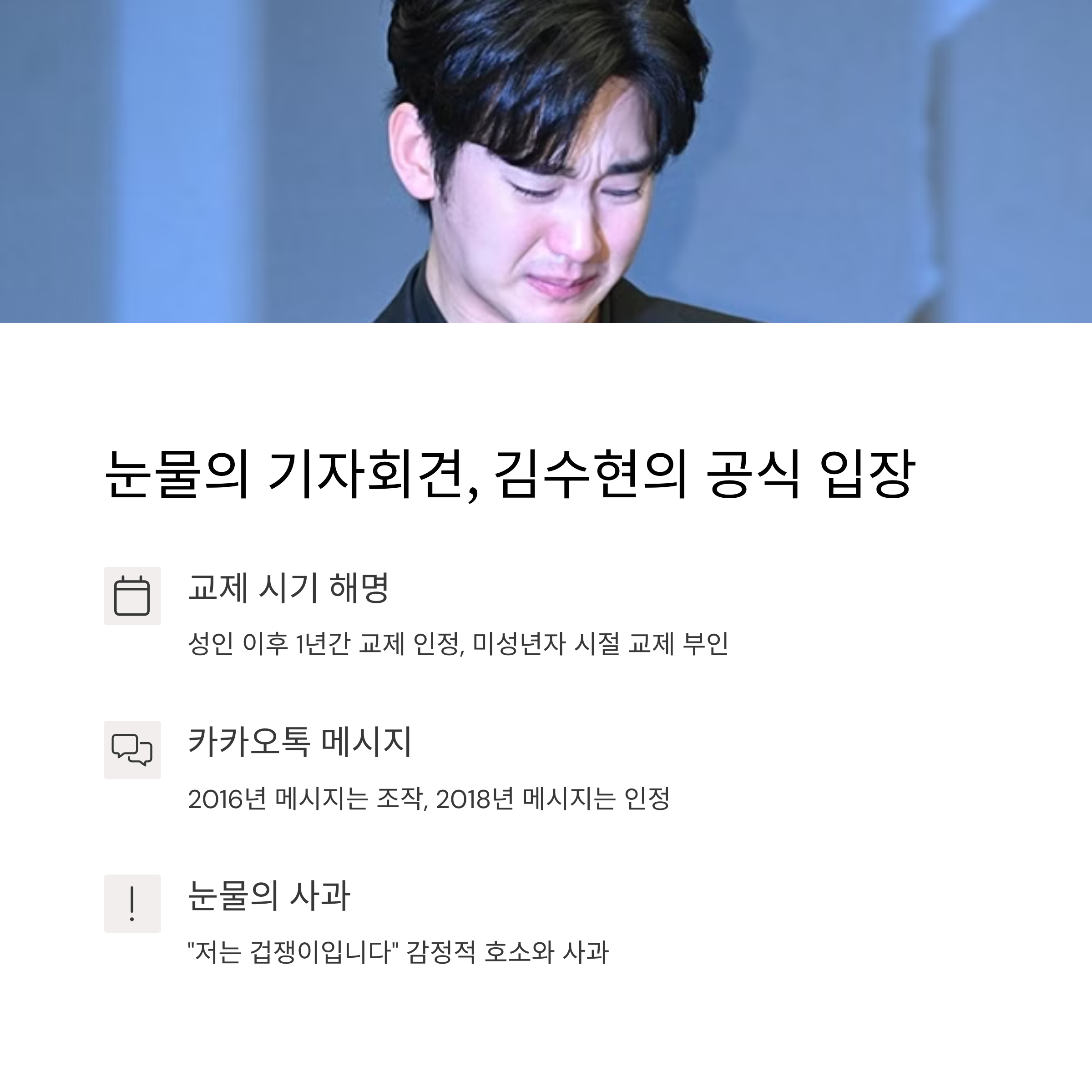 기자회견에는 김수현 본인과 소속사 골드메달리스트의 법률 대리인이 참석했으며, 입장 발표만 진행하고 별도의 질의응답은 없었습니다. 김수현은 기자회견 중 목소리를 떨고 눈물을 흘리는 등 감정이 북받치는 모습을 보였다고 해요.