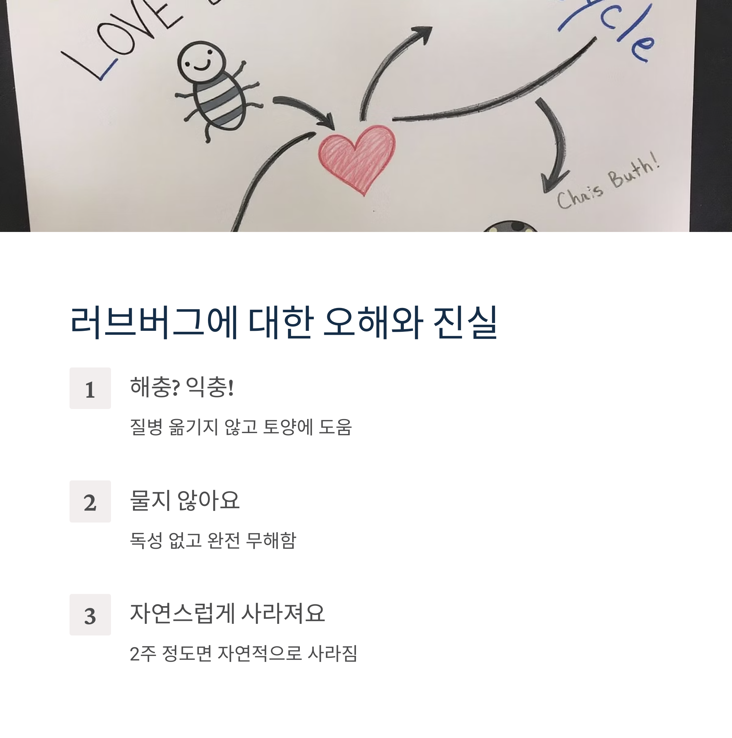 진실: 러브버그는 익충이에요! 질병을 옮기지 않고, 애벌레는 토양을 비옥하게 만드는 역할을 해요. 단지 대량으로 나타나서 불편함을 주는 거죠.
