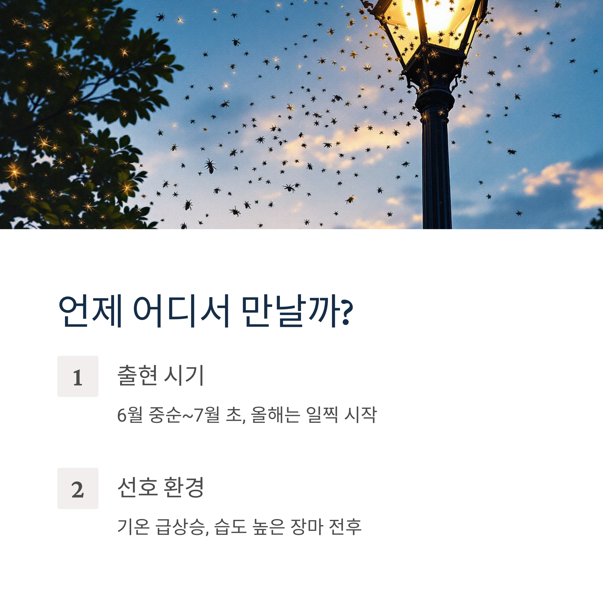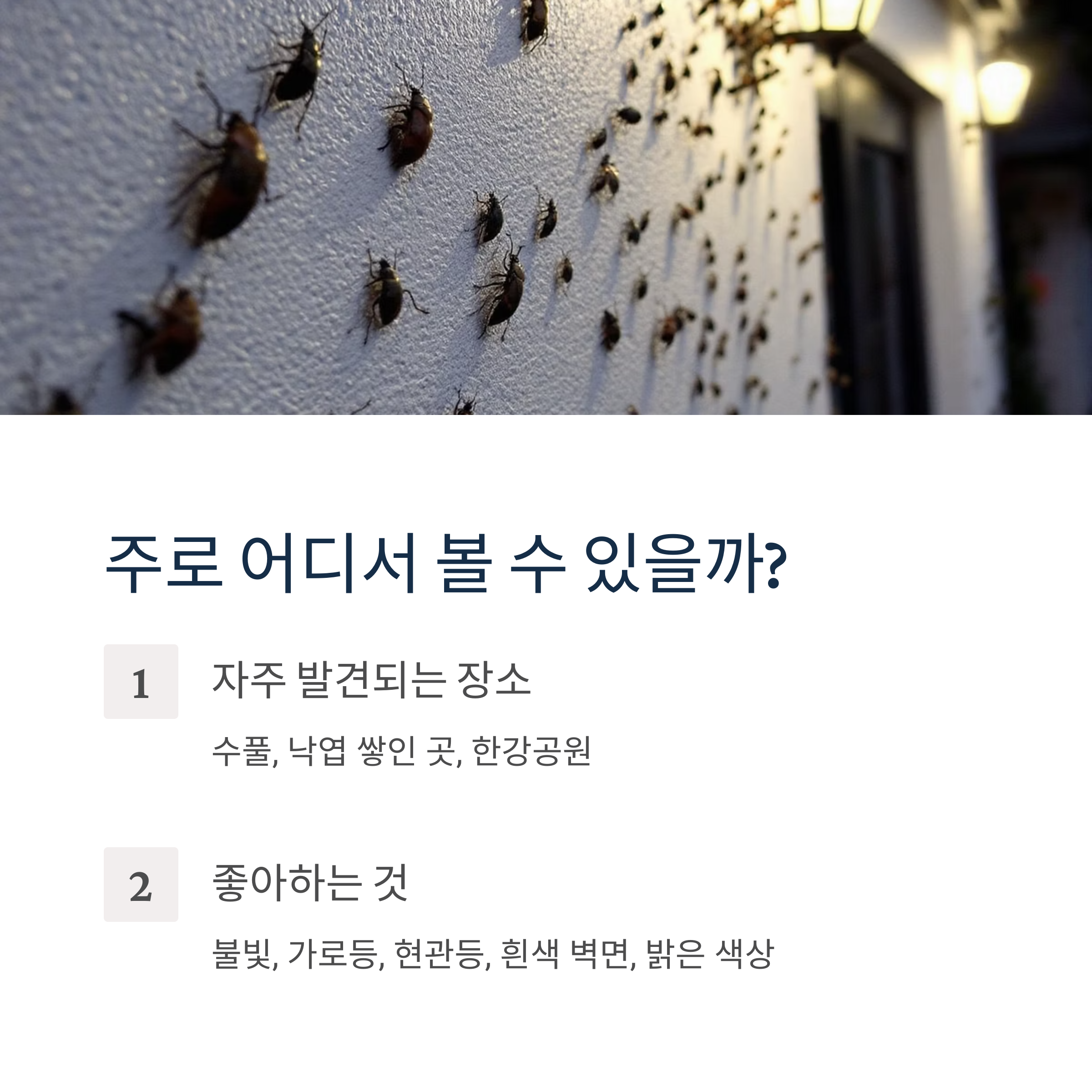 이들은 불빛을 좋아해서 밤에 가로등 주변이나 집 현관등 근처에도 모여들어요. 제가 저녁에 집에 들어갈 때마다 현관문 앞에 붙어있는 걸 봤거든요. 또 유리창이나 흰색 벽면을 특히 좋아하더라고요.