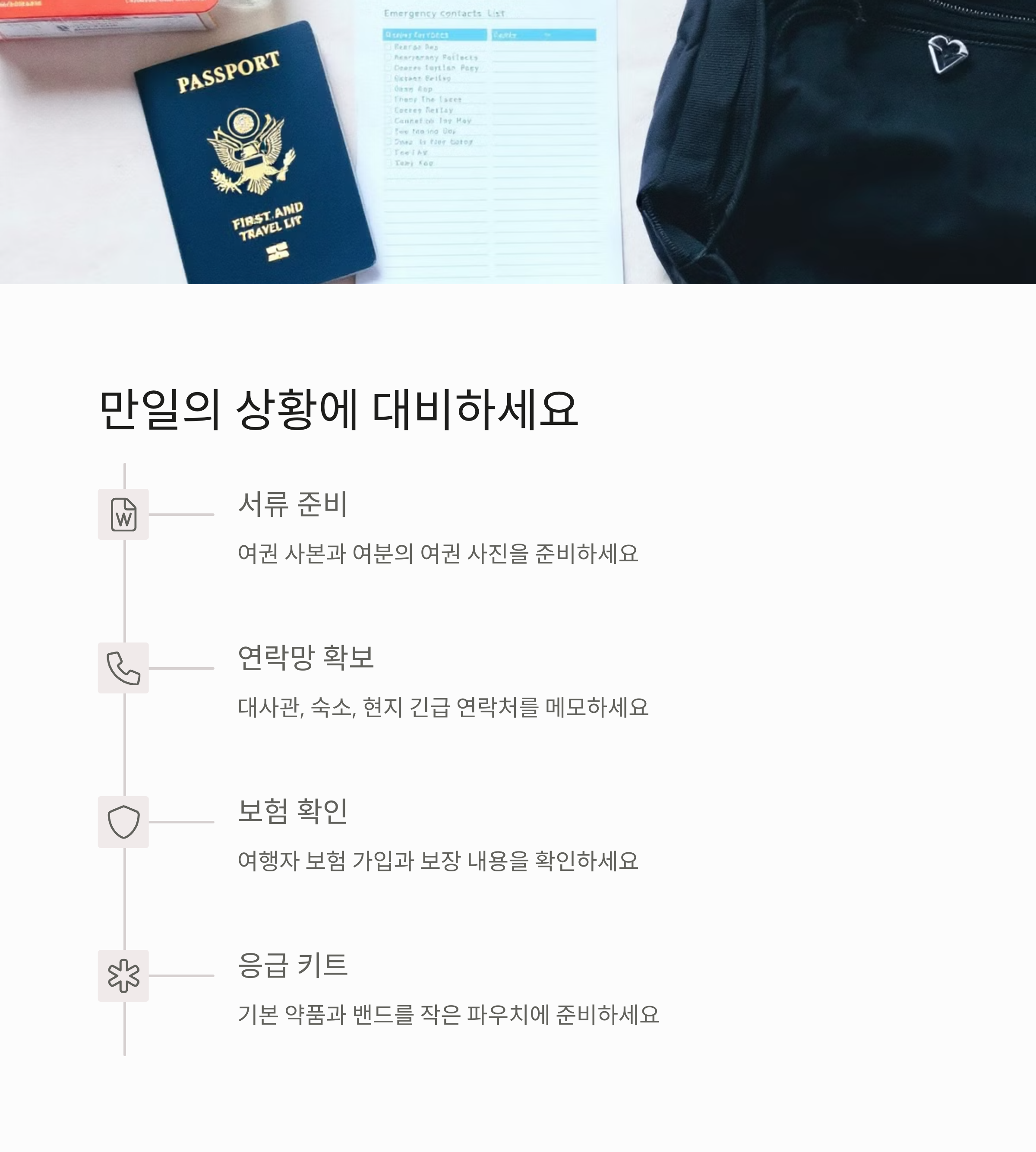 또한 여행자 보험은 꼭 들고 가세요! 해외에서 의료비는 상상 이상으로 비싸요. 보험 증서와 긴급 연락처는 스마트폰에 저장하고, 프린트해서 가방에도 넣어두는 것이 좋아요.