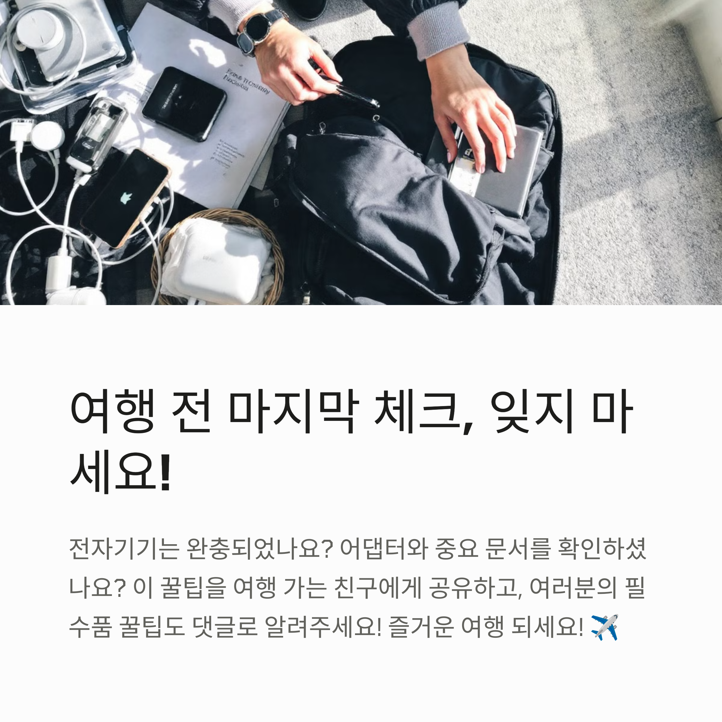 여러분의 여행 경험이나 꿀팁이 있다면 댓글로 공유해주세요! 다른 여행자들에게도 큰 도움이 될 거예요. 다음에는 국가별 콘센트 종류와 전압 차이에 대한 정보도 정리해볼게요. 모두 즐거운 여행 되세요! ✈️