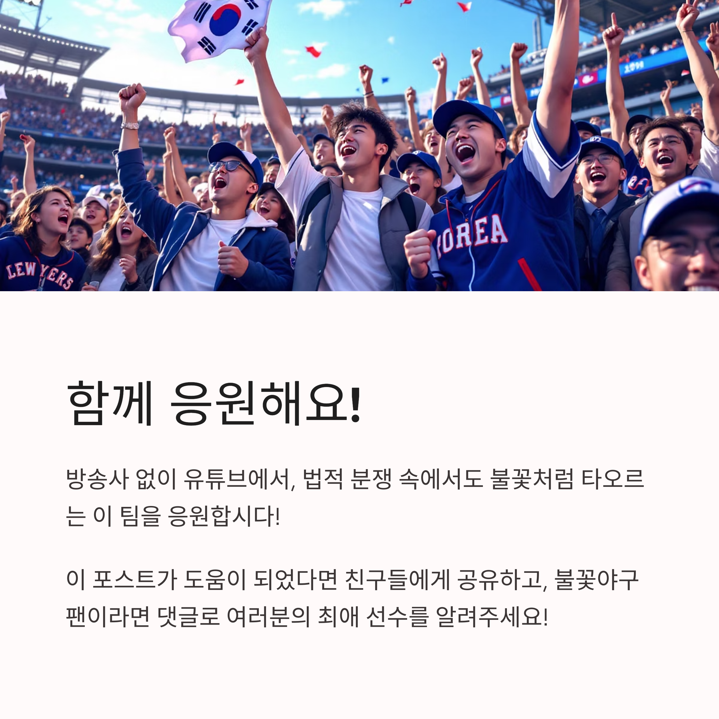여러분, 오늘은 불꽃야구 멤버들에 대해 제가 알고 있는 모든 것을 나눠봤어요. 방송사 없이 유튜브라는 새로운 플랫폼에서, 그리고 법적 분쟁이라는 악조건 속에서도 불꽃처럼 타오르고 있는 이 멤버들의 미래가 정말 기대돼요.