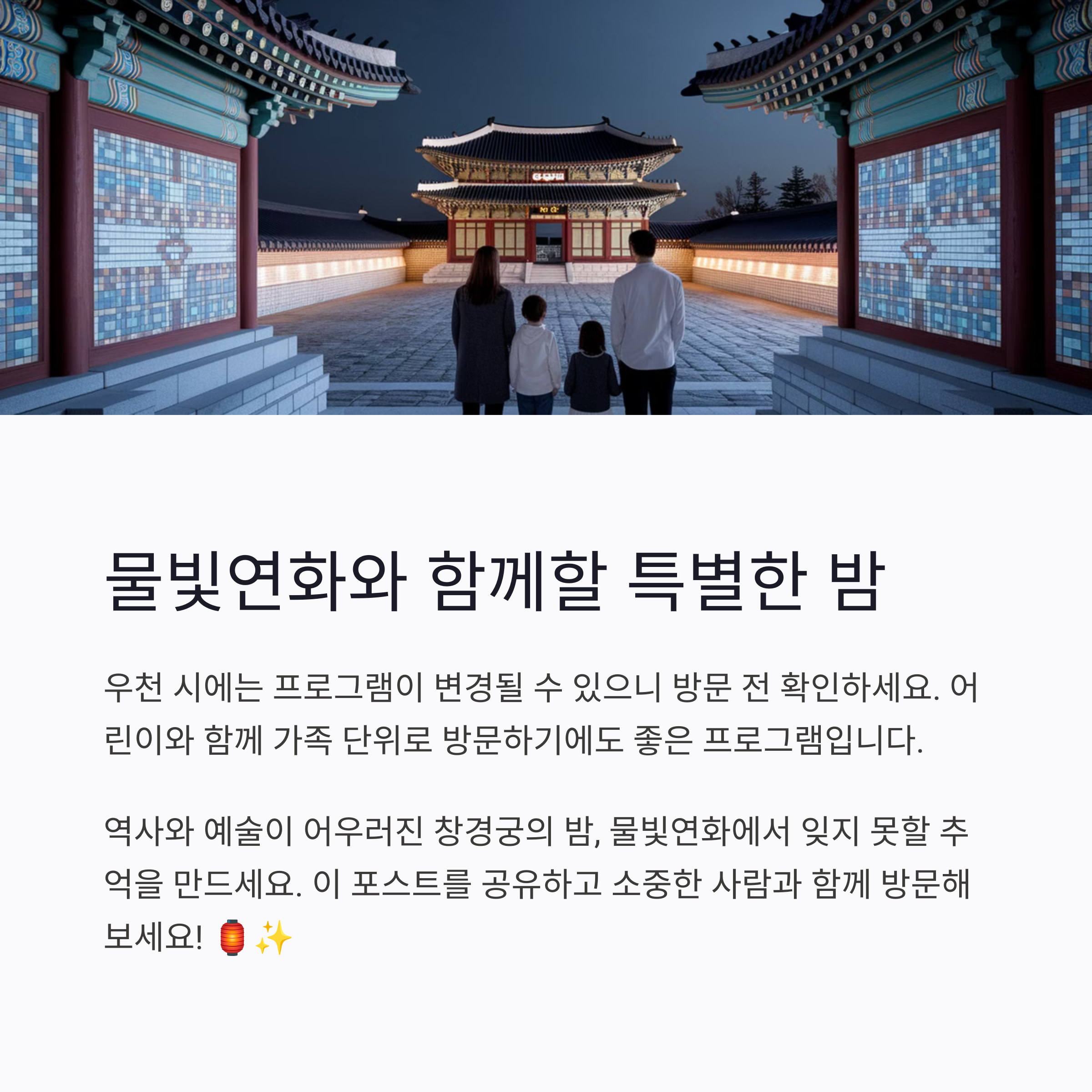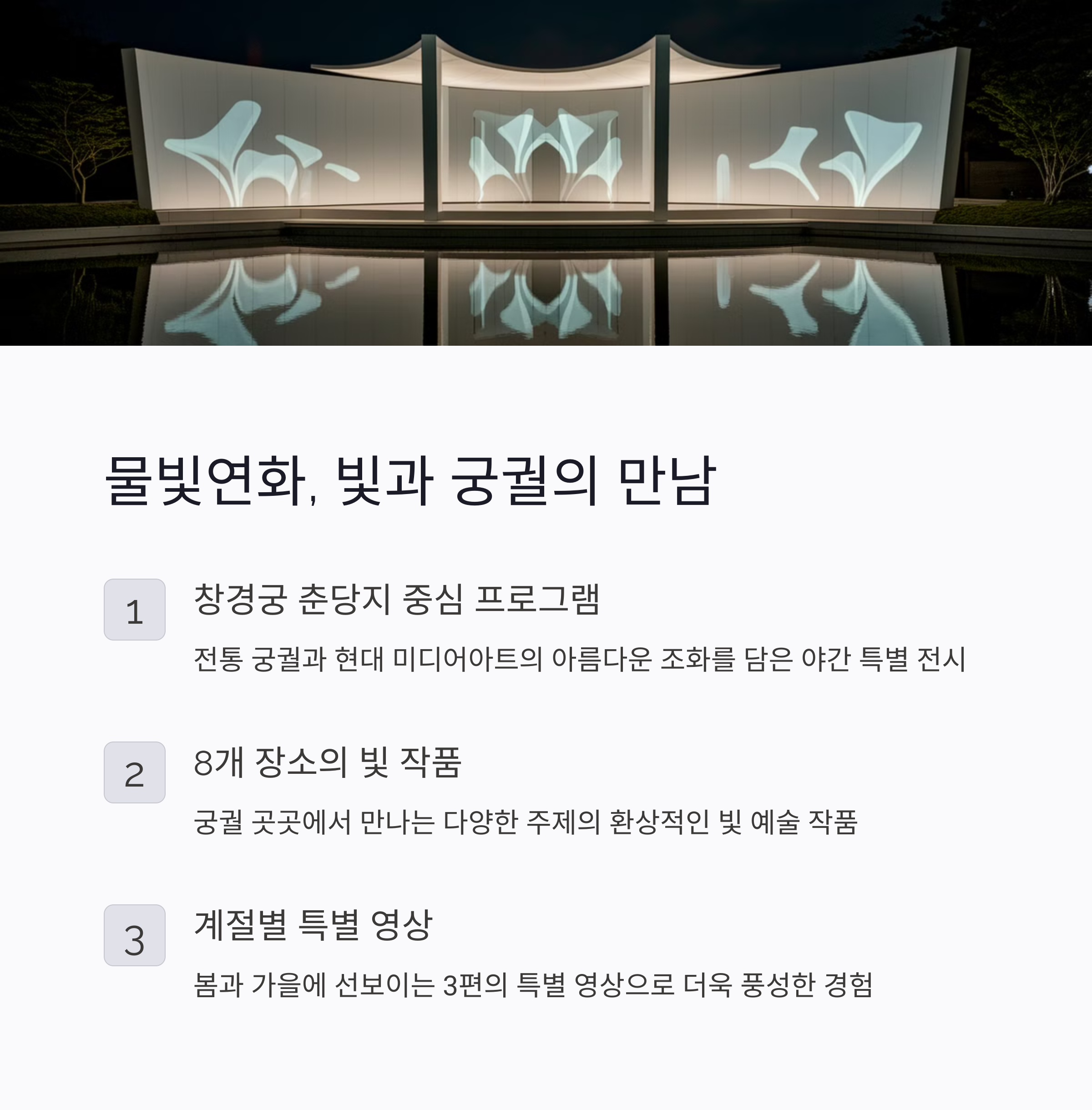 안녕하세요! 오늘은 서울의 4대 궁 중 하나인 창경궁에서 열리는 특별한 야간 프로그램, 2025 창경궁 물빛연화에 대해 소개해드리려고 합니다.