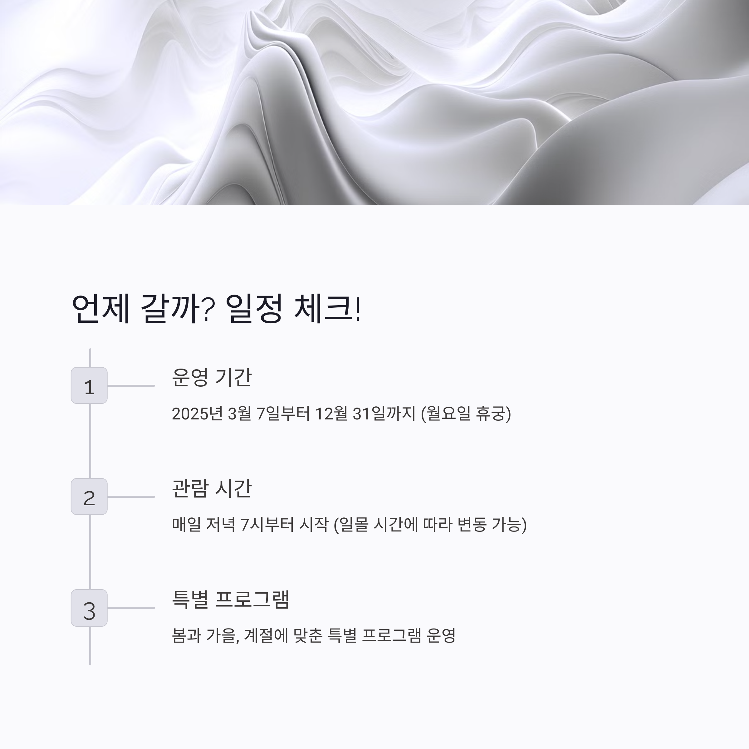 2025년 물빛연화는 3월 7일부터 12월 31일까지 진행되며, 월요일은 휴궁일입니다. 운영 시간은 기간별로 조금씩 다른데요.