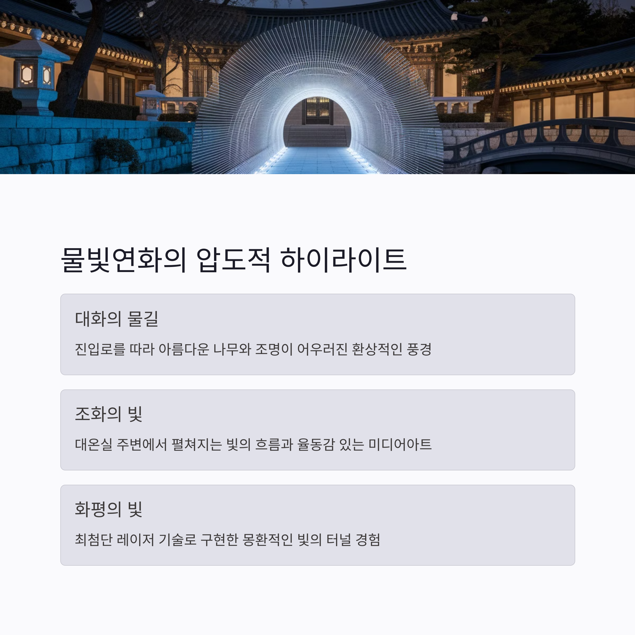 - '달빛 연꽃': 전통 건축의 색채인 단청을 현대적으로 재해석한 작품으로, 조선 시대의 이야기를 빛으로 표현합니다.