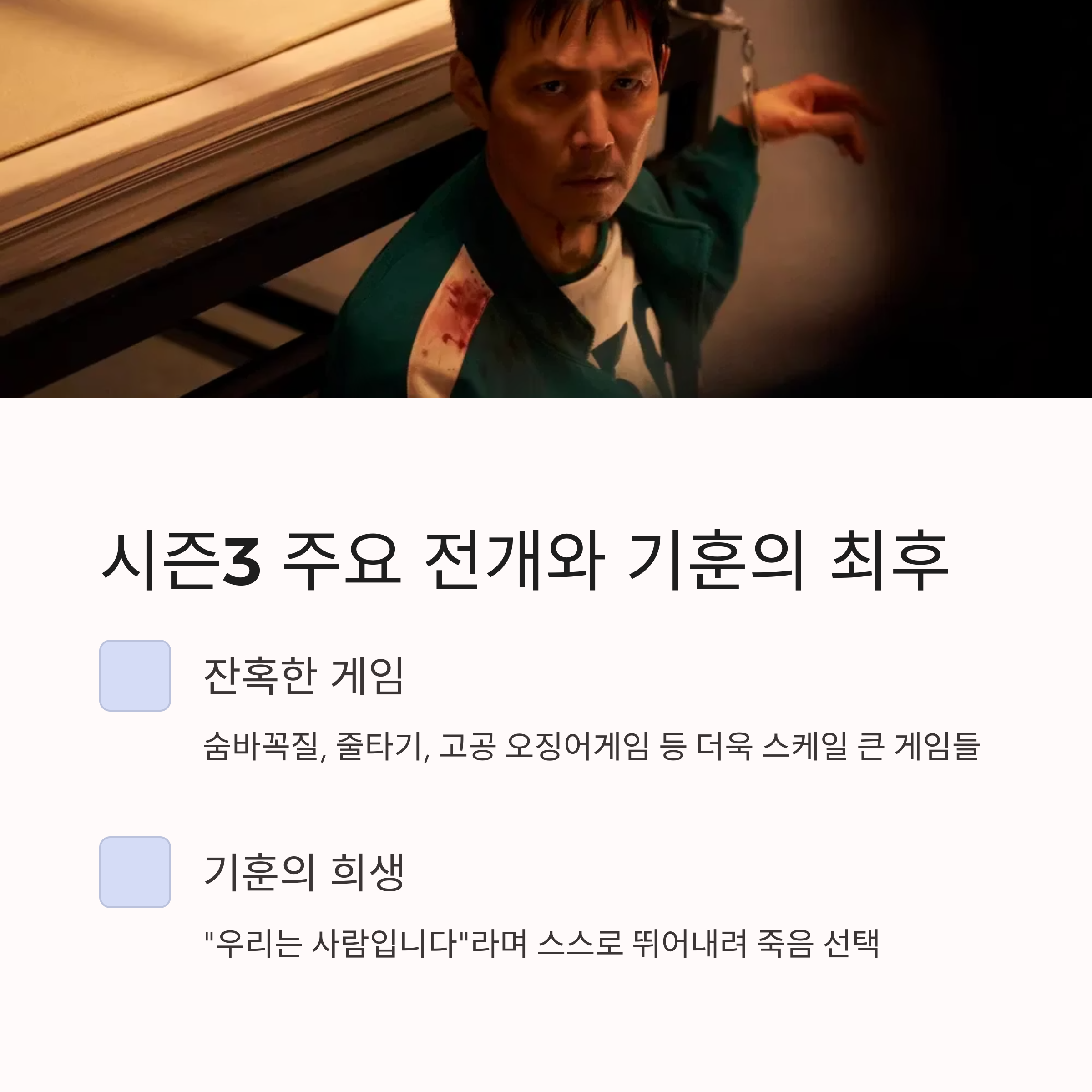 해시태그: #오징어게임시즌3, #오징어게임결말, #오징어게임스포일러, #기훈최후, #프론트맨, #베이비우승, #넷플릭스, #오징어게임분석, #드라마결말, #황동혁감독