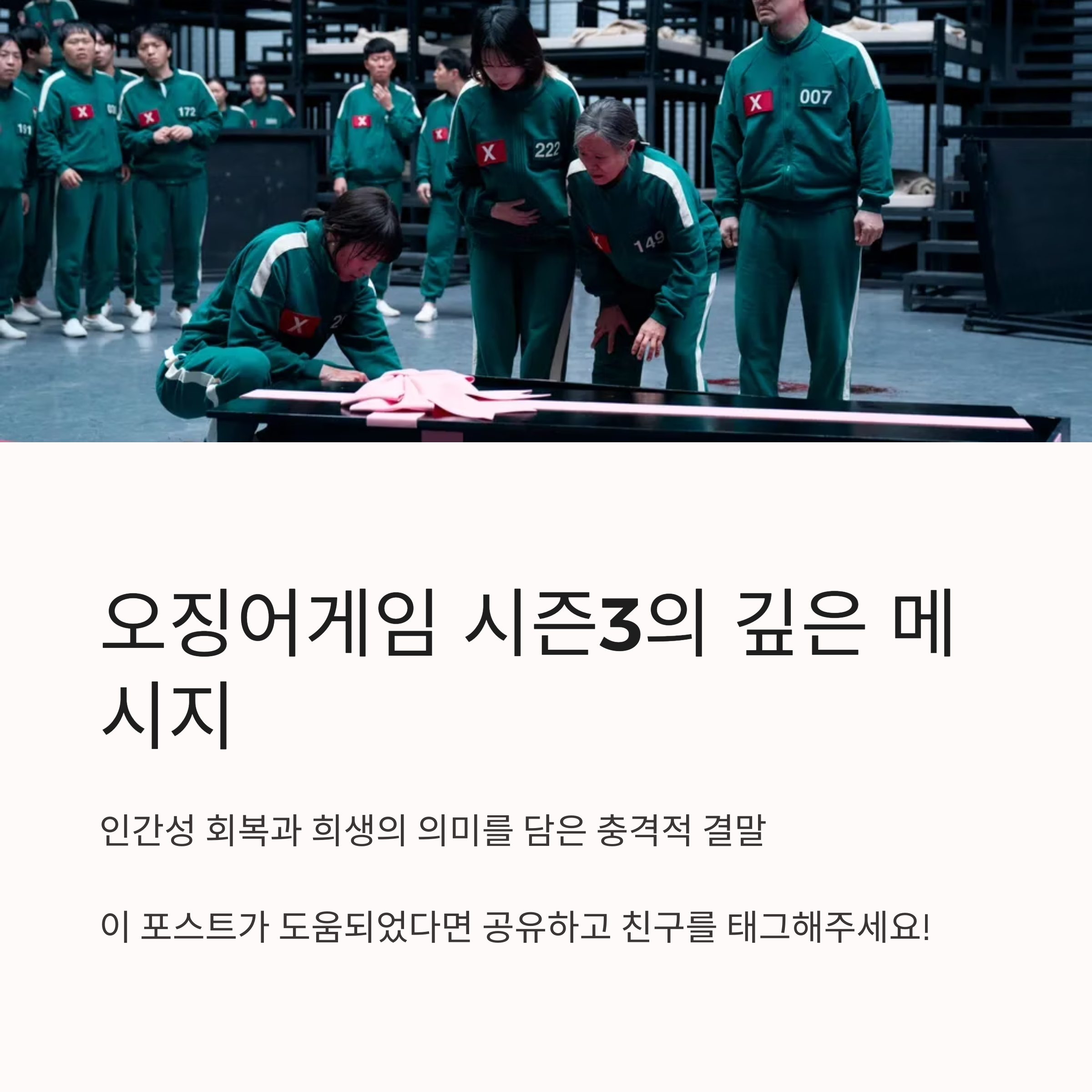 오징어게임 시즌3는 기훈의 희생과 베이비 우승으로 인간성 회복을 그린 충격적인 결말입니다! 여러분도 분명 할 수 있어요! 시즌3를 다시 보며 깊은 메시지를 느껴보시길 추천합니다.