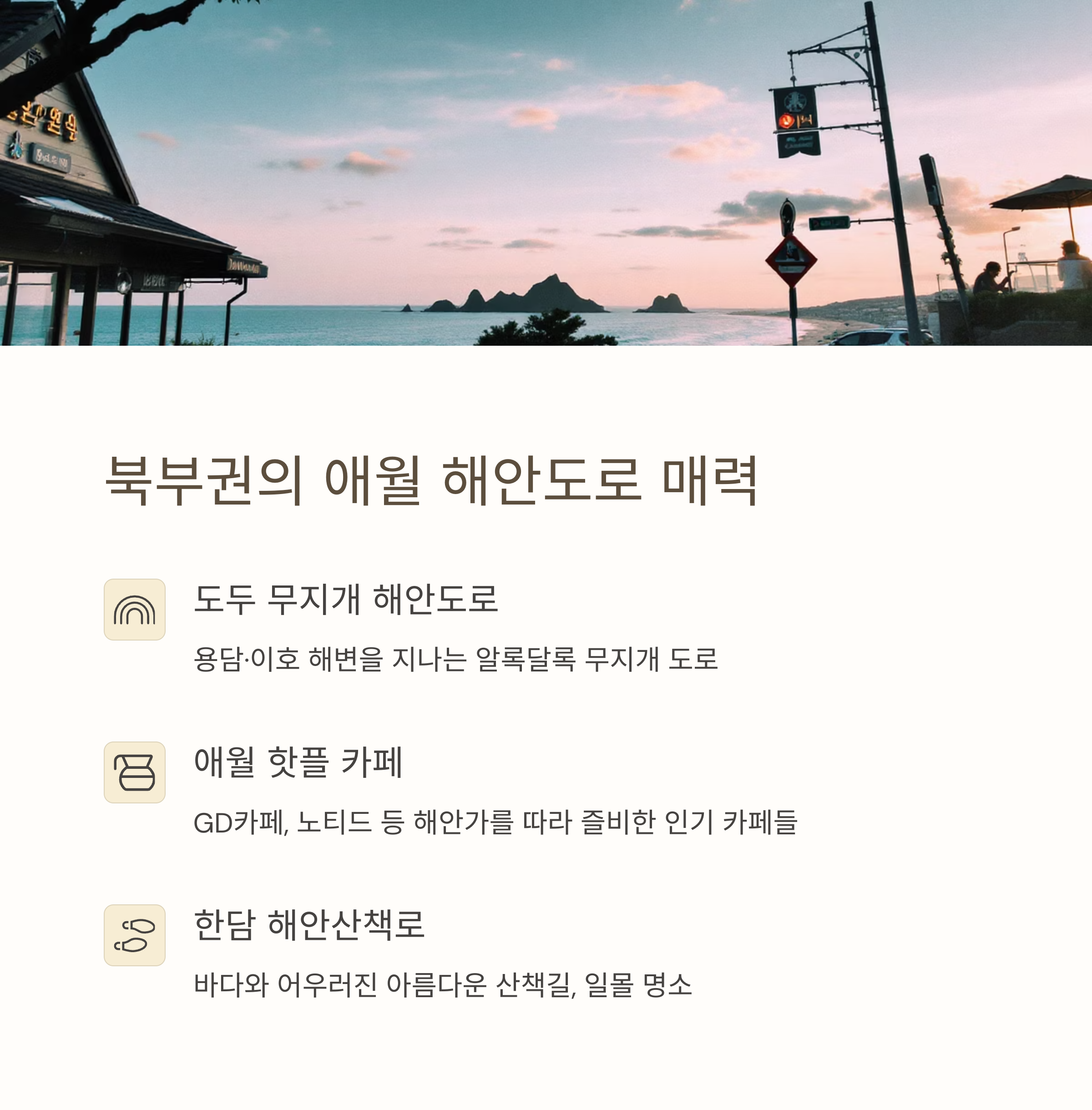 제주 북부권은 애월 해안도로가 압도적인 인기를 자랑합니다. 제주국제공항에서 시작해 용두암, 애월해안도로, 한림읍까지 이어지는 약 35km 구간은 제주 북부의 낭만을 느낄 수 있는 코스입니다. 🌞