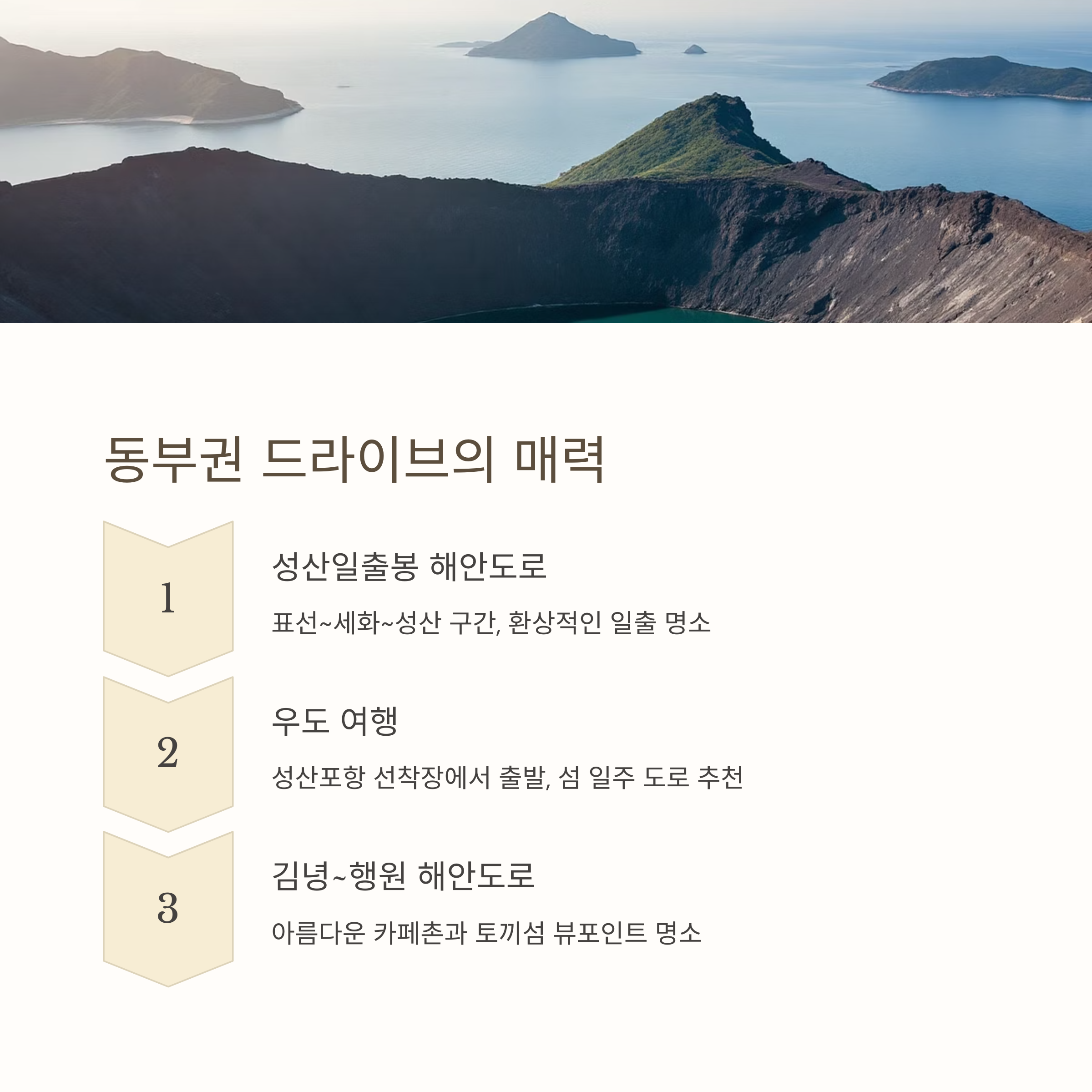 제주 동부권은 성산일출봉을 중심으로 아름다운 해안 드라이브 코스가 펼쳐집니다. 성산일출봉에서 출발해 광치기 해변을 지나 우도 선착장까지 이어지는 약 15km 구간은 제주 동부의 정수를 느낄 수 있는 코스입니다. 🌅