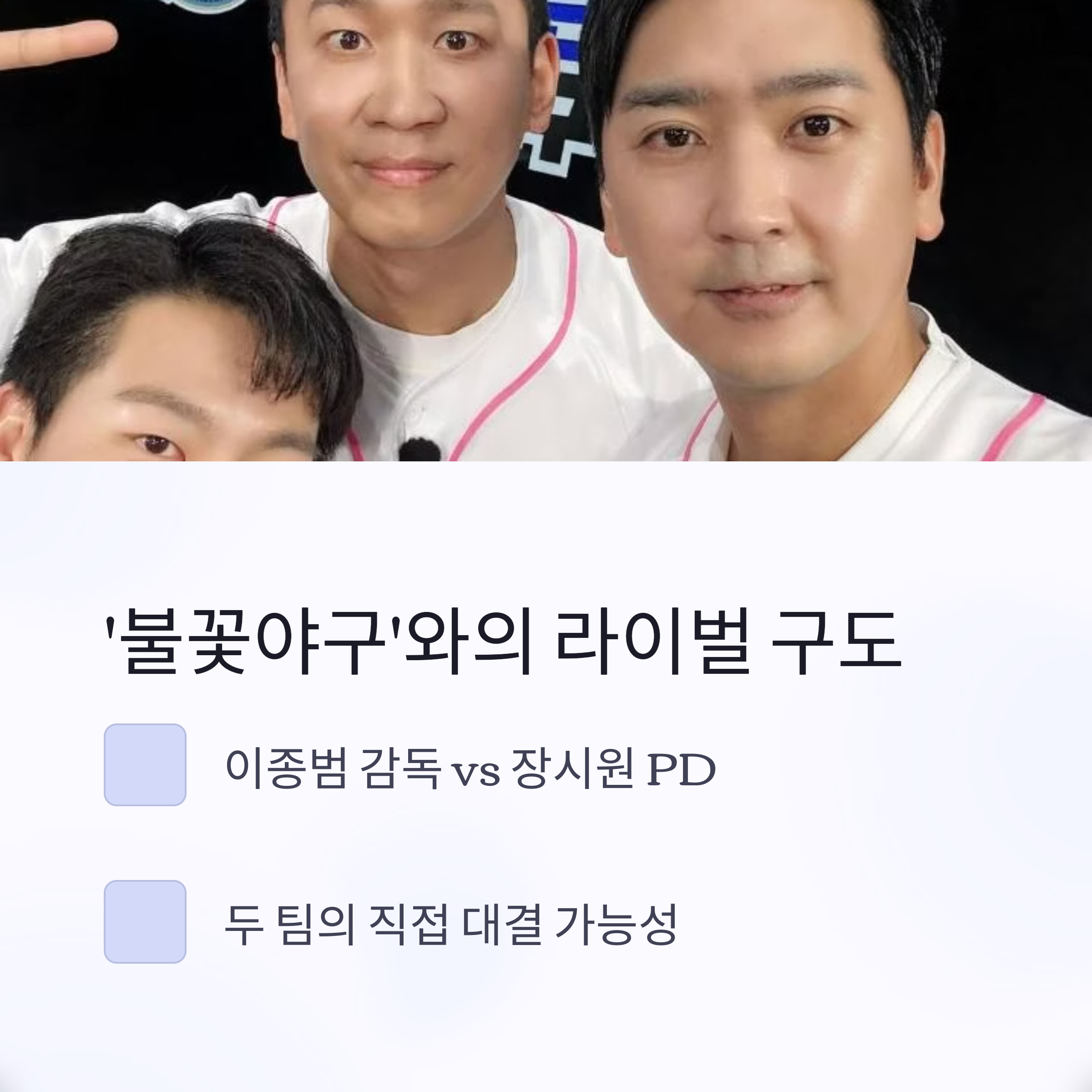 ‘최강야구’ 시즌3 제작진이 만든 ‘불꽃야구’와의 대결 구도도 주목할 부분이에요. 기존 멤버 상당수가 ‘불꽃야구’로 이적하면서 예능계 야구 라이벌이 생긴 셈인데요, JTBC는 완전히 새로운 제작진과 포맷, 감독, 멤버로 시즌4를 재구성하며 정면 승부를 예고했습니다.