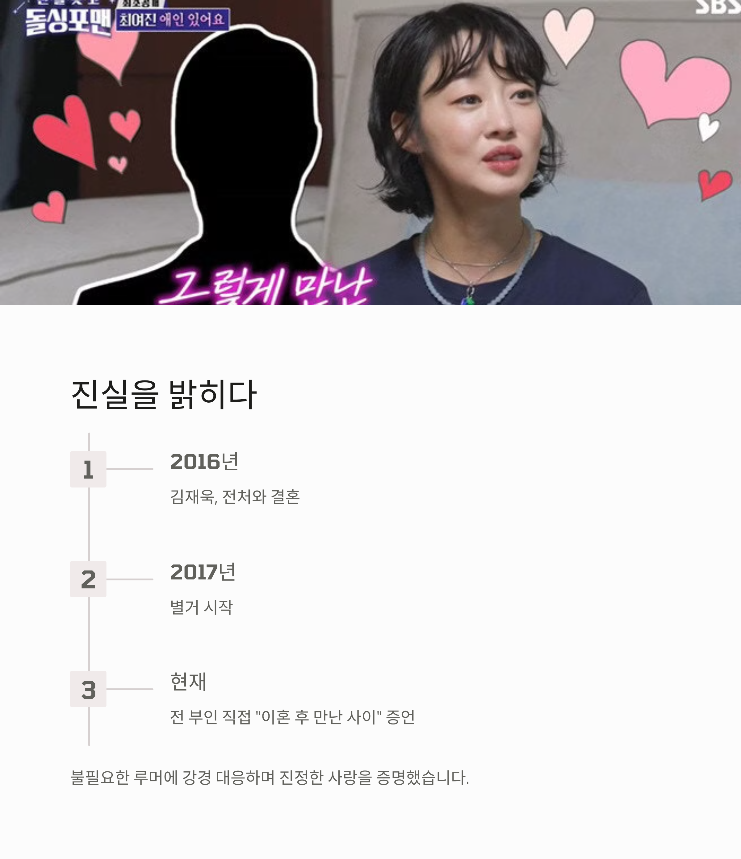 이에 대해 일부 누리꾼들은 두 사람의 만남이 그때부터 시작된 것이 아니냐는 추측을 했지만, 김재욱의 전 부인은 지난 3월 31일 방송된 '동상이몽2'에서 최여진과 통화하며 "유튜브에 이상한 게(불륜설) 떠다니더라. 내가 계정 다 신고했다. 나랑 이혼하고 만난 건데 말들이 많다"며 최여진을 위로했어요