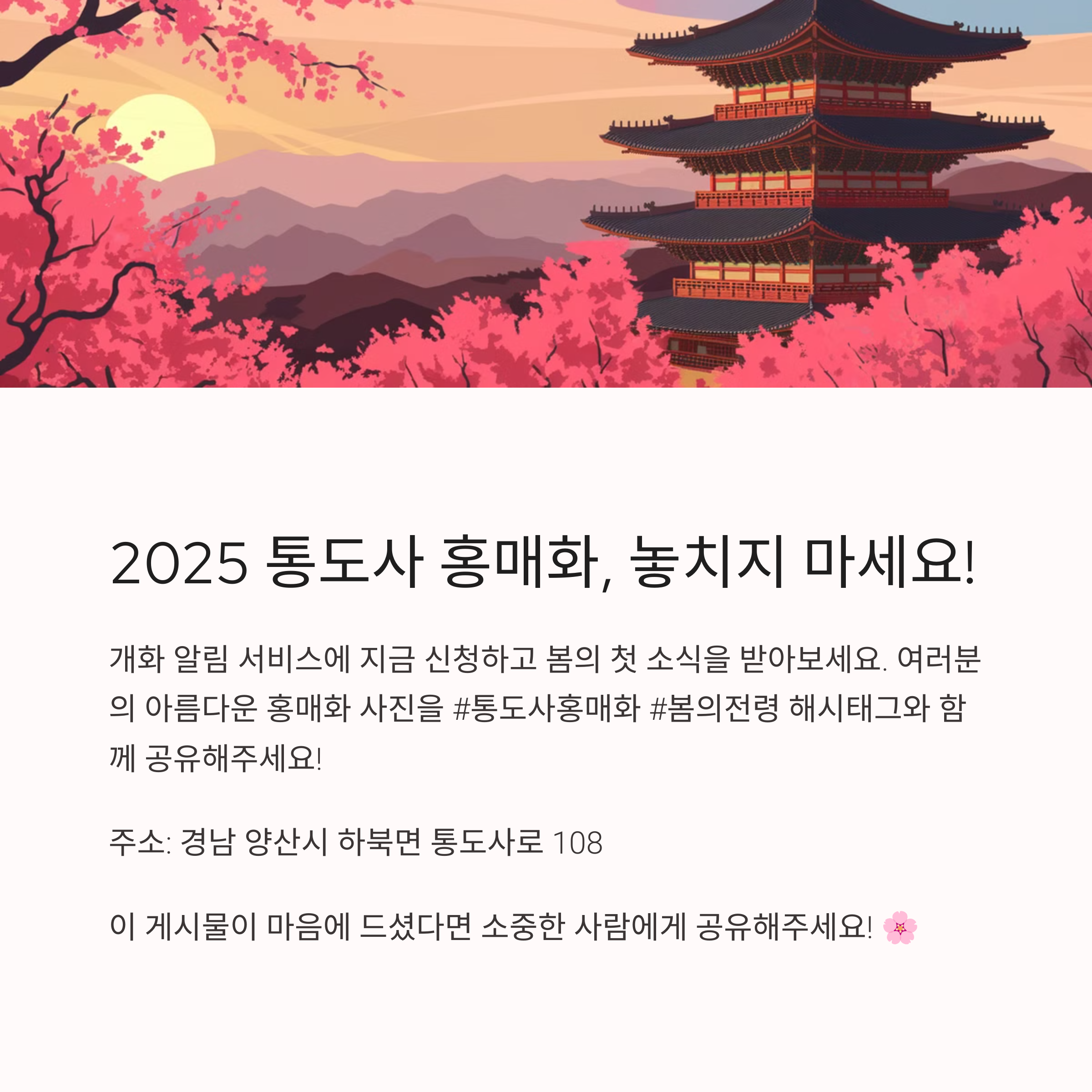 통도사의 홍매화는 단순히 아름다운 꽃 이상의 의미를 지닙니다. 천년 고찰과 어우러진 풍경 속에서 자연의 생명력을 느끼고 힐링할 수 있는 특별한 경험을 선사하죠. 이번 봄에는 통도사를 찾아 홍매화와 함께 따뜻한 시간을 보내보세요! 🌸