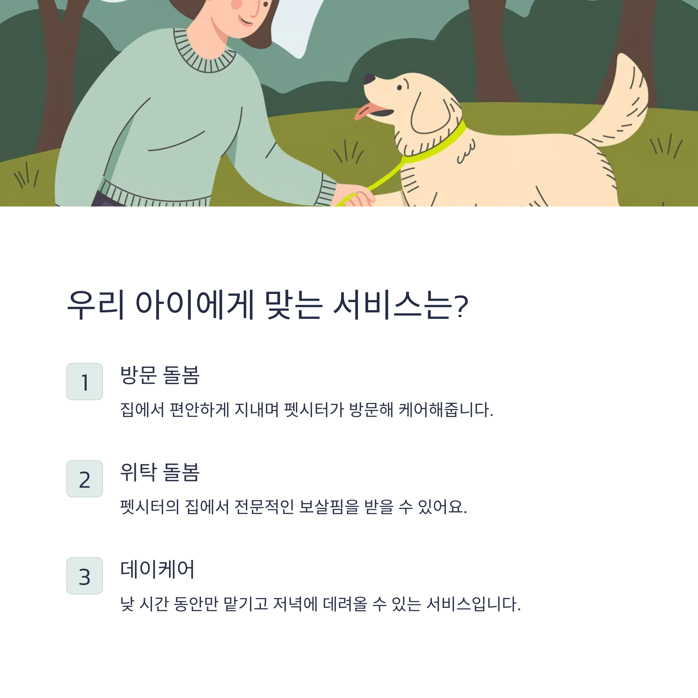 방문 돌봄: 펫시터가 직접 여러분의 집으로 찾아가서 케어해주는 서비스예요. 우리 아이가 나이가 많거나 건강상의 이유로 이동이 어렵다면 이 서비스가 딱이에요!