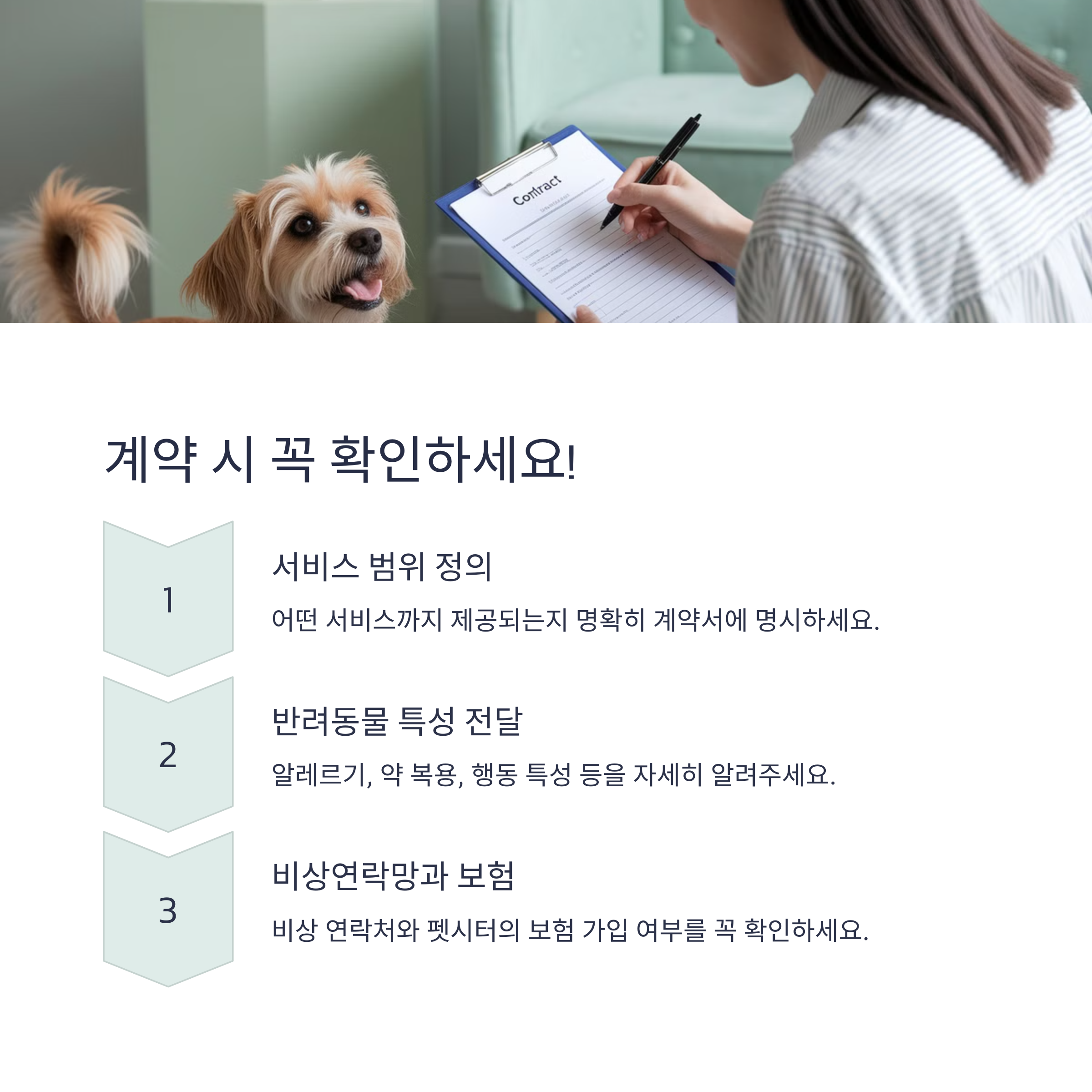 A: 계약 전에 반드시 서비스 범위를 명확히 확인해야 해요. 산책 포함 여부, 식사 제공 시간, 놀이 시간, 약물 투여 가능 여부 등을 사전에 확인하면 추후 문제를 예방할 수 있어요.