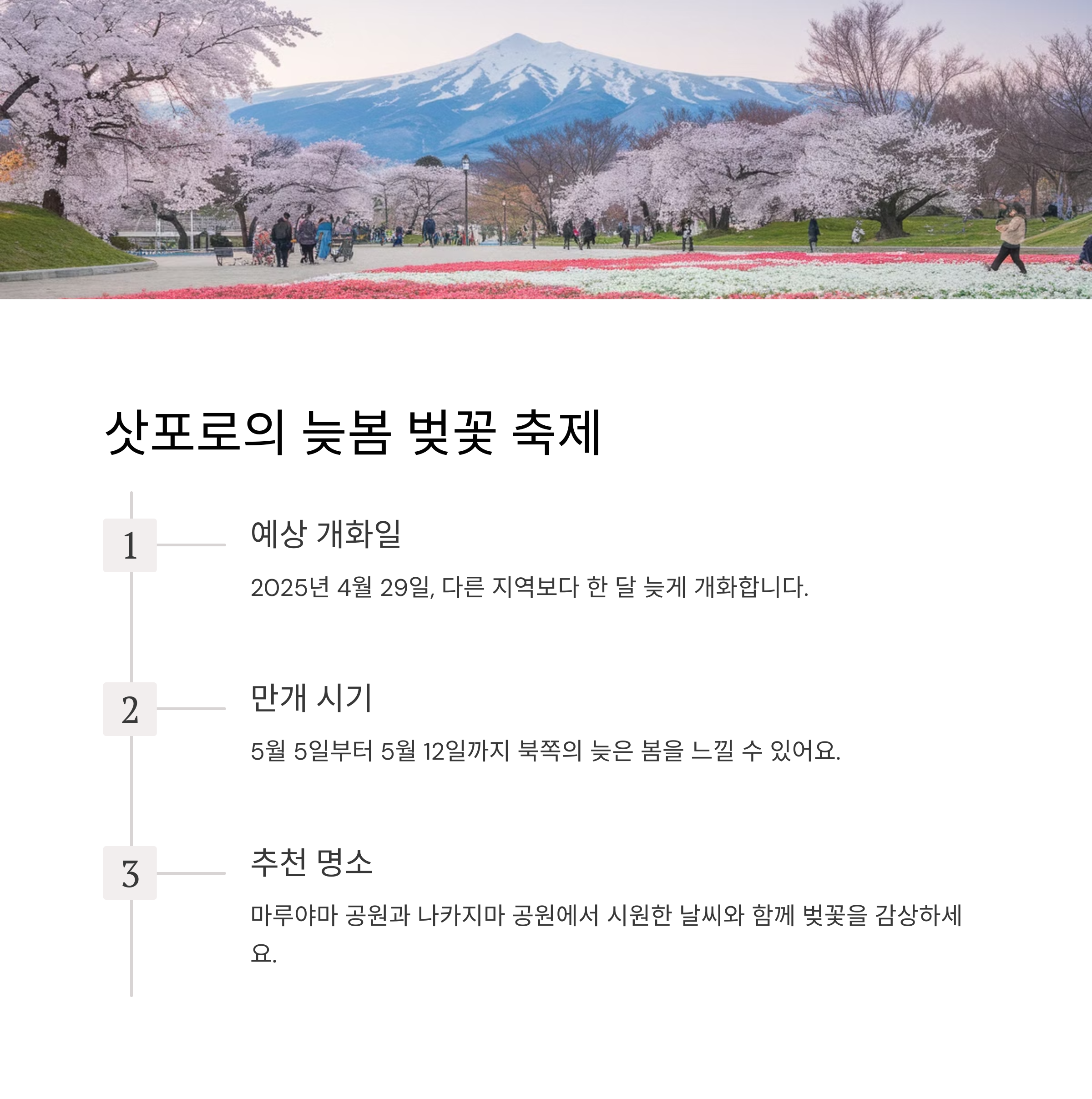 더욱 북쪽인 홋카이도 삿포로는 가장 늦게 개화하는 지역이에요. 삿포로의 개화 시작은 무려 4월 말(4월27
