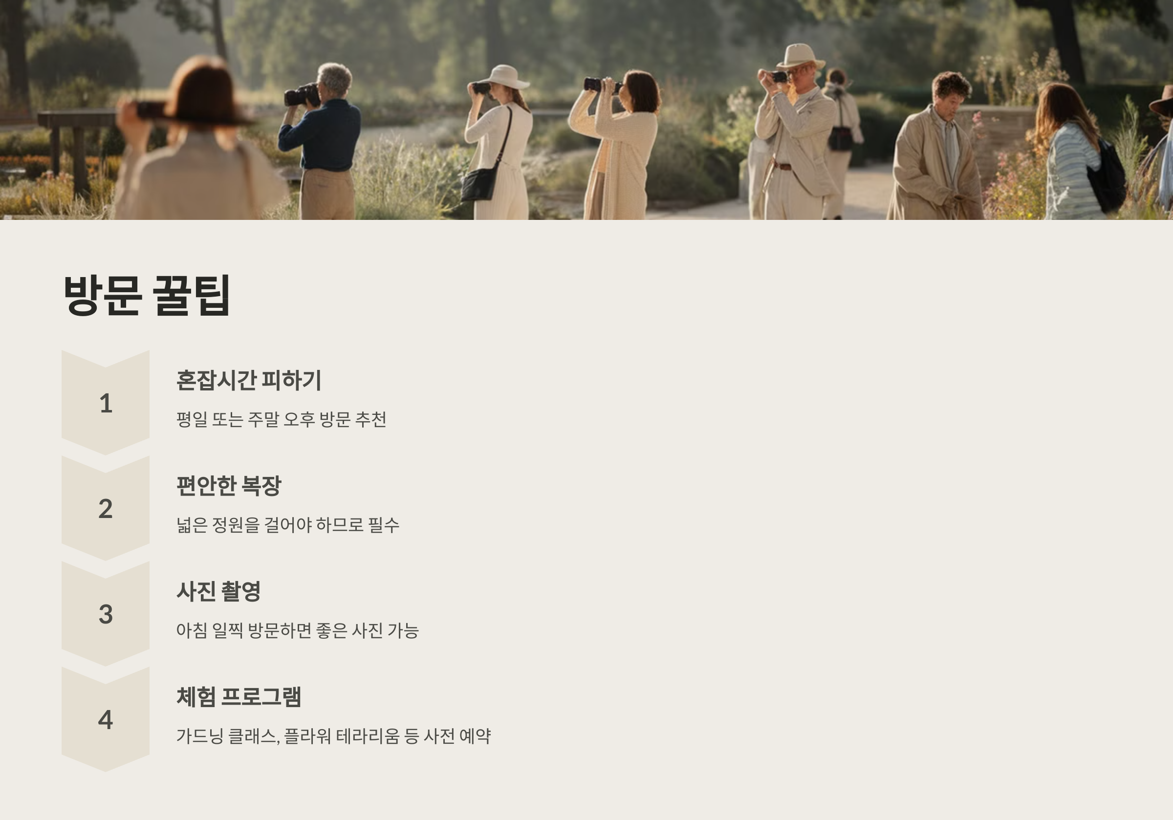 - 편안한 신발과 옷차림: 넓은 정원을 걸어야 하므로 필수