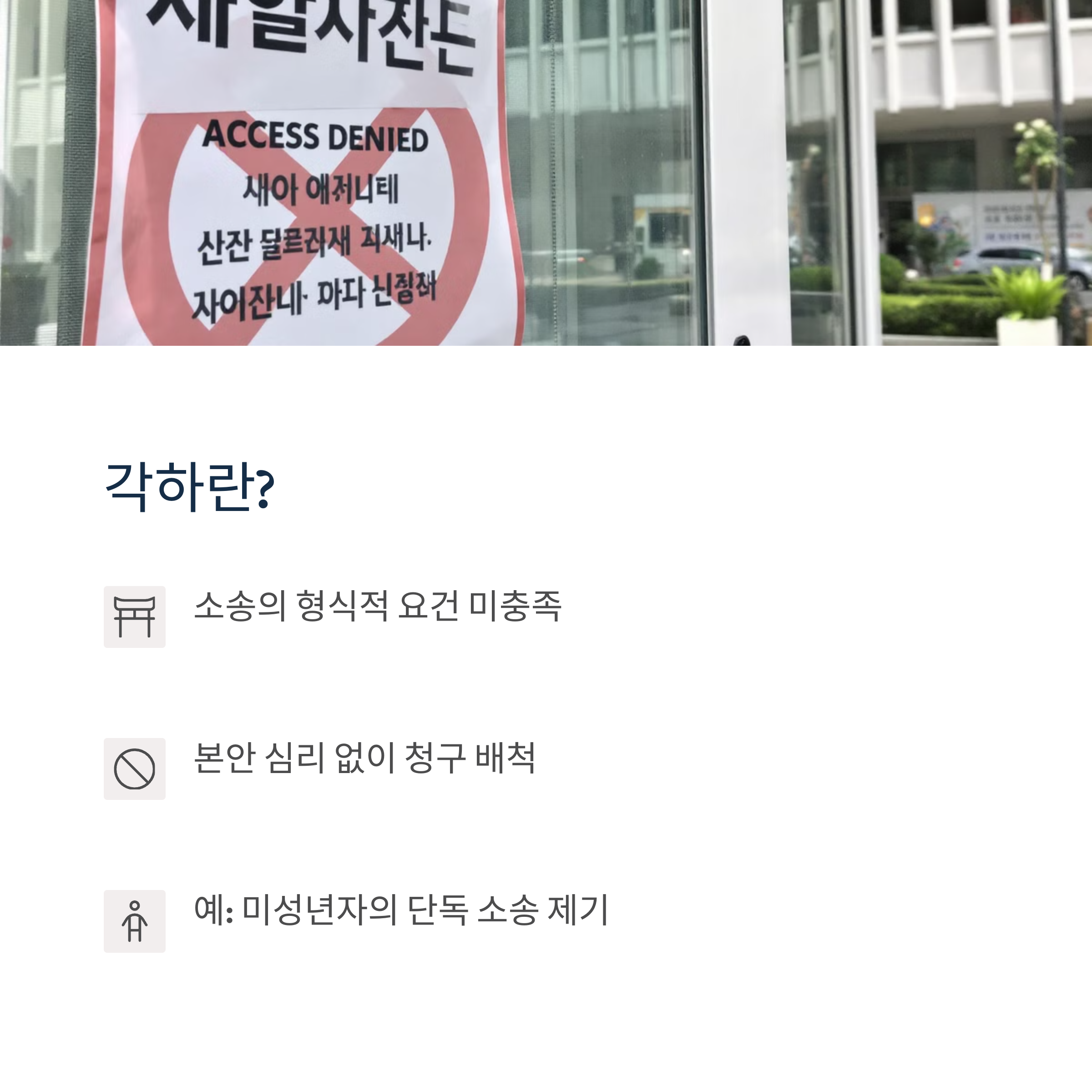 법률에서 정한 소송 제기 기간(예: 행정소송의 90일)이 지났다면 내용을 살펴볼 필요 없이 각하됩니다. - 소송 당사자 자격이 없는 경우