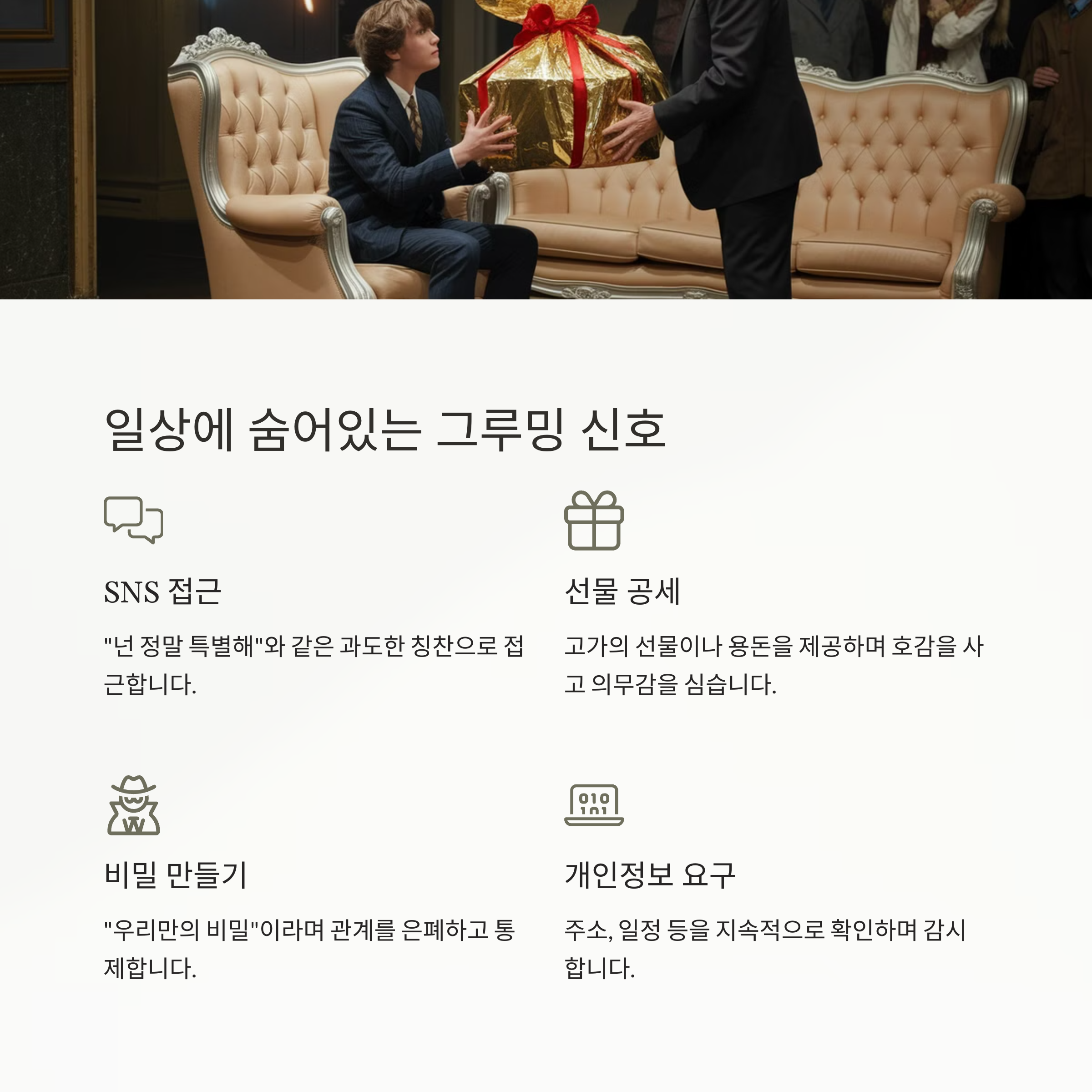 그루밍은 단순한 "호의"처럼 보일 수 있어 더 위험합니다.