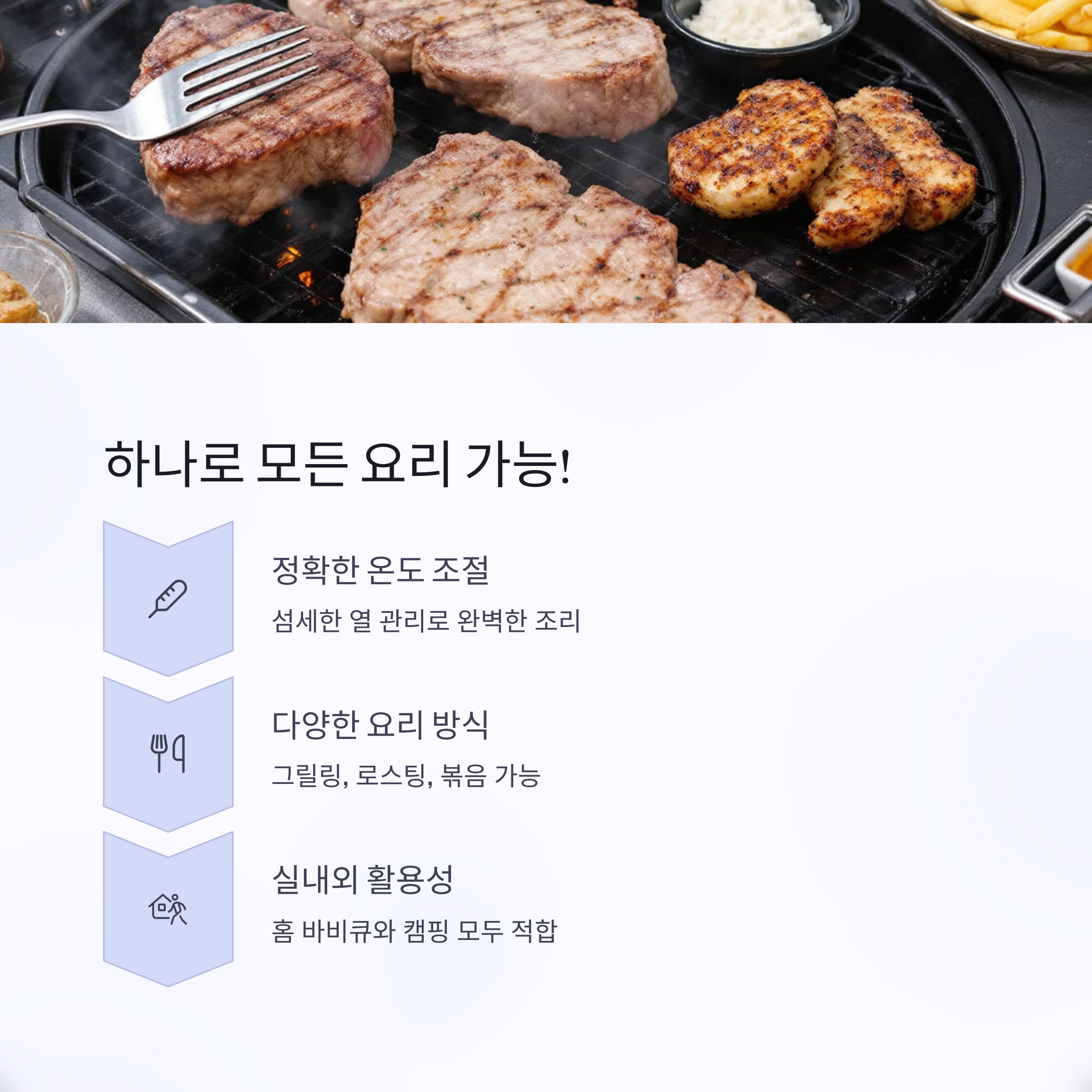 그릴 위에서 고기를 구울 수도 있고, 냄비나 팬을 올려놓고 요리를 할 수도 있어요. 넓은 조리 공간은 8인분까지 커버 가능하여 가족 단위의 식사에도 부족함이 없습니다