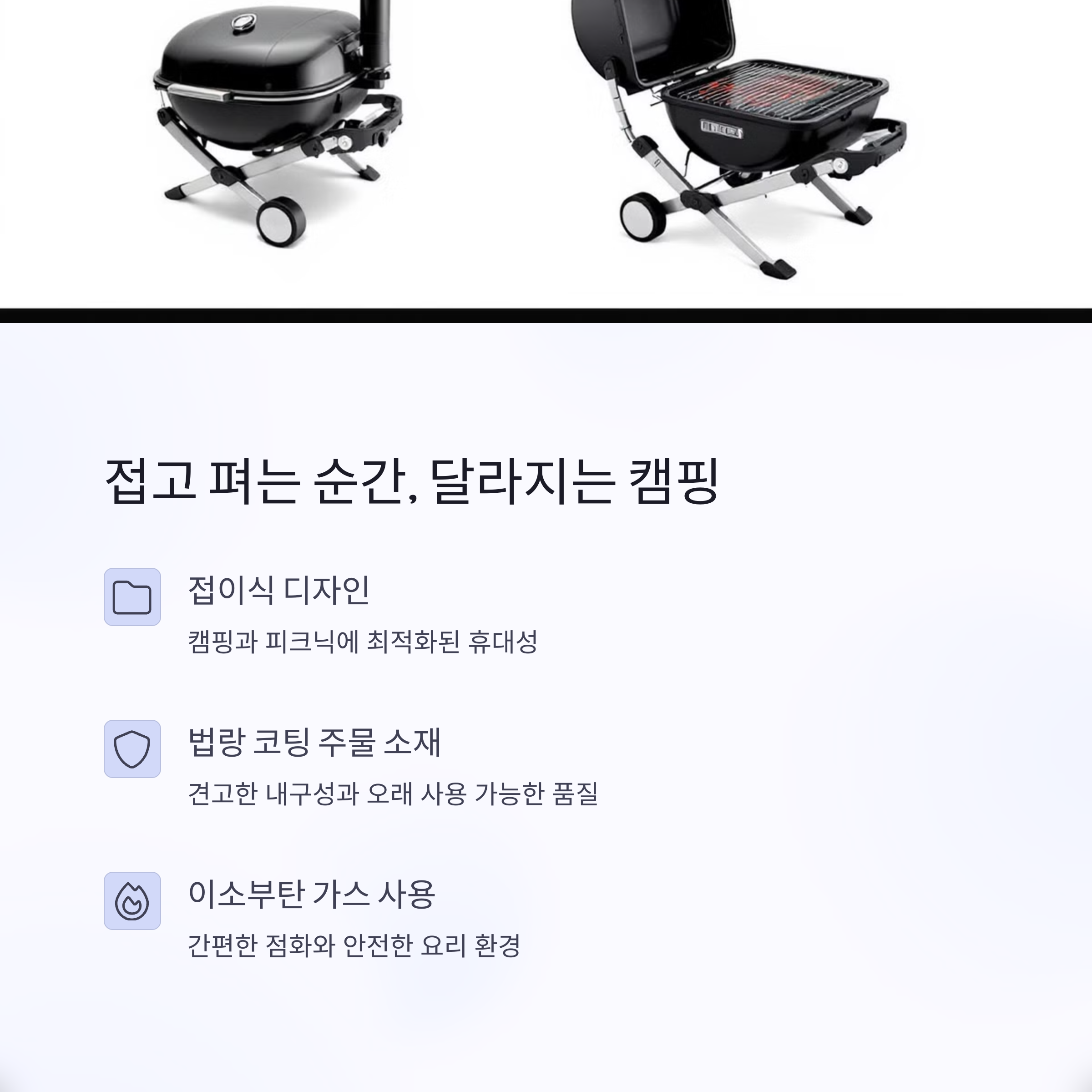 웨버 트래블러 가스그릴의 가장 큰 특징은 접이식 디자인입니다[1]. 사용하지 않을 때는 평평하게 접어서 보관할 수 있어 휴대성이 뛰어나죠. 또한 법랑 코팅과 주물 소재로 만들어져 내구성이 매우 뛰어나고 녹슬지 않아 오랫동안 사용할 수 있습니다