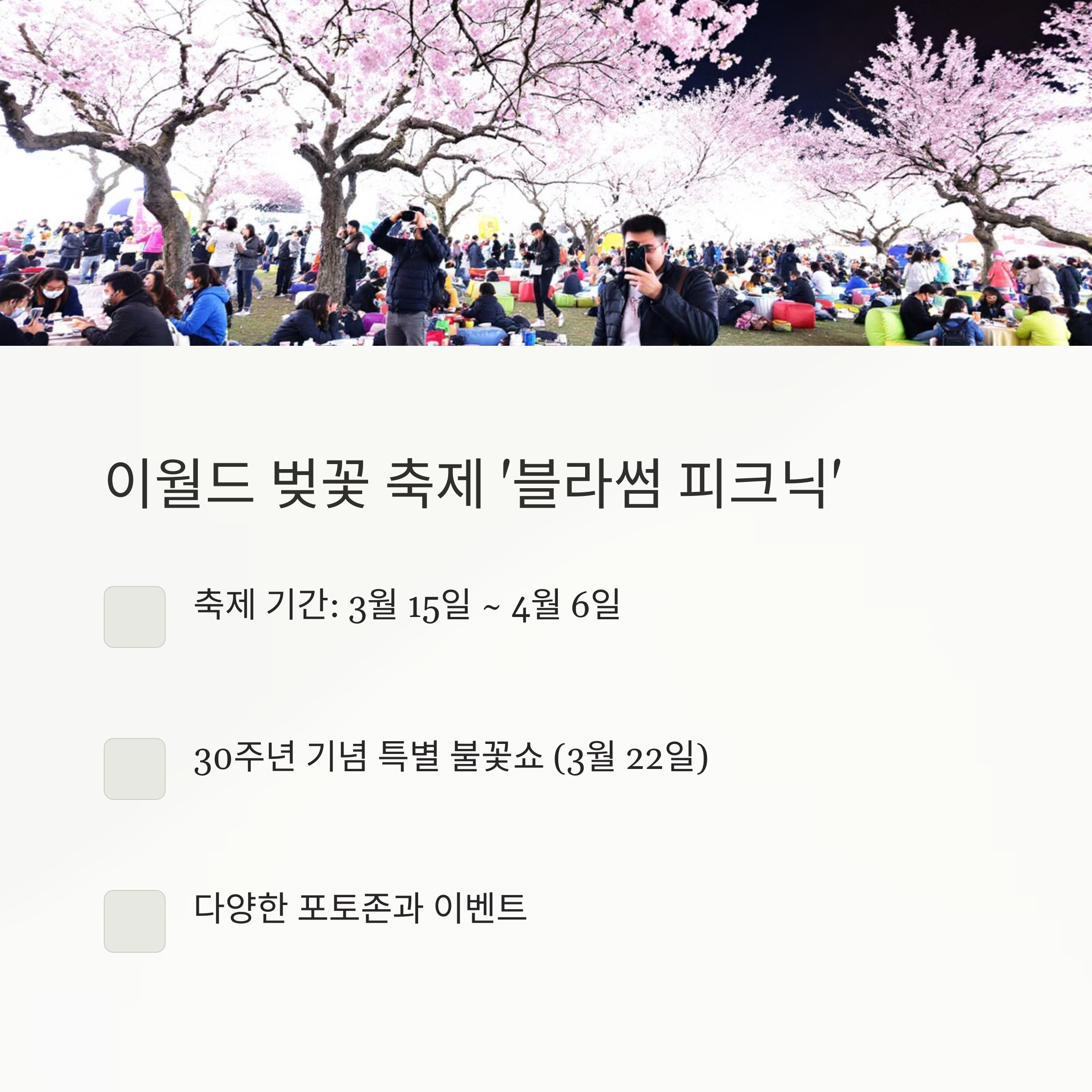 - 📱 카메라/스마트폰: 아름다운 벚꽃 사진은 필수!