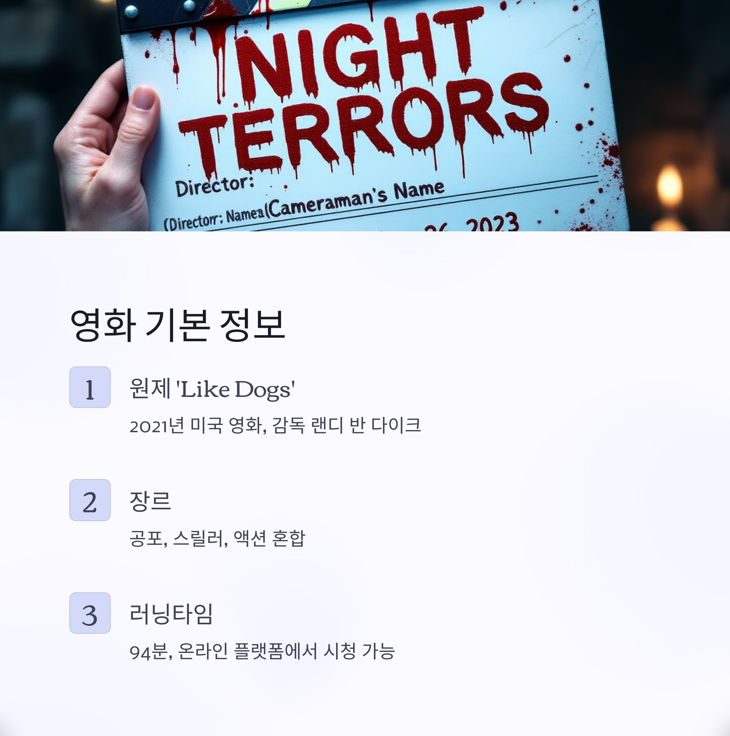 영화 개목걸이의 원제는 'Like Dogs'이고, 2021년에 제작된 미국 영화예요1. 감독은 랜디 반 다이크(Randy Van Dyke)가 맡았고, 장르는 공포, 스릴러, 액션이 혼합된 형태예요. 러닝타임은 94분으로 적당한 길이라서 부담 없이 볼 수 있어요