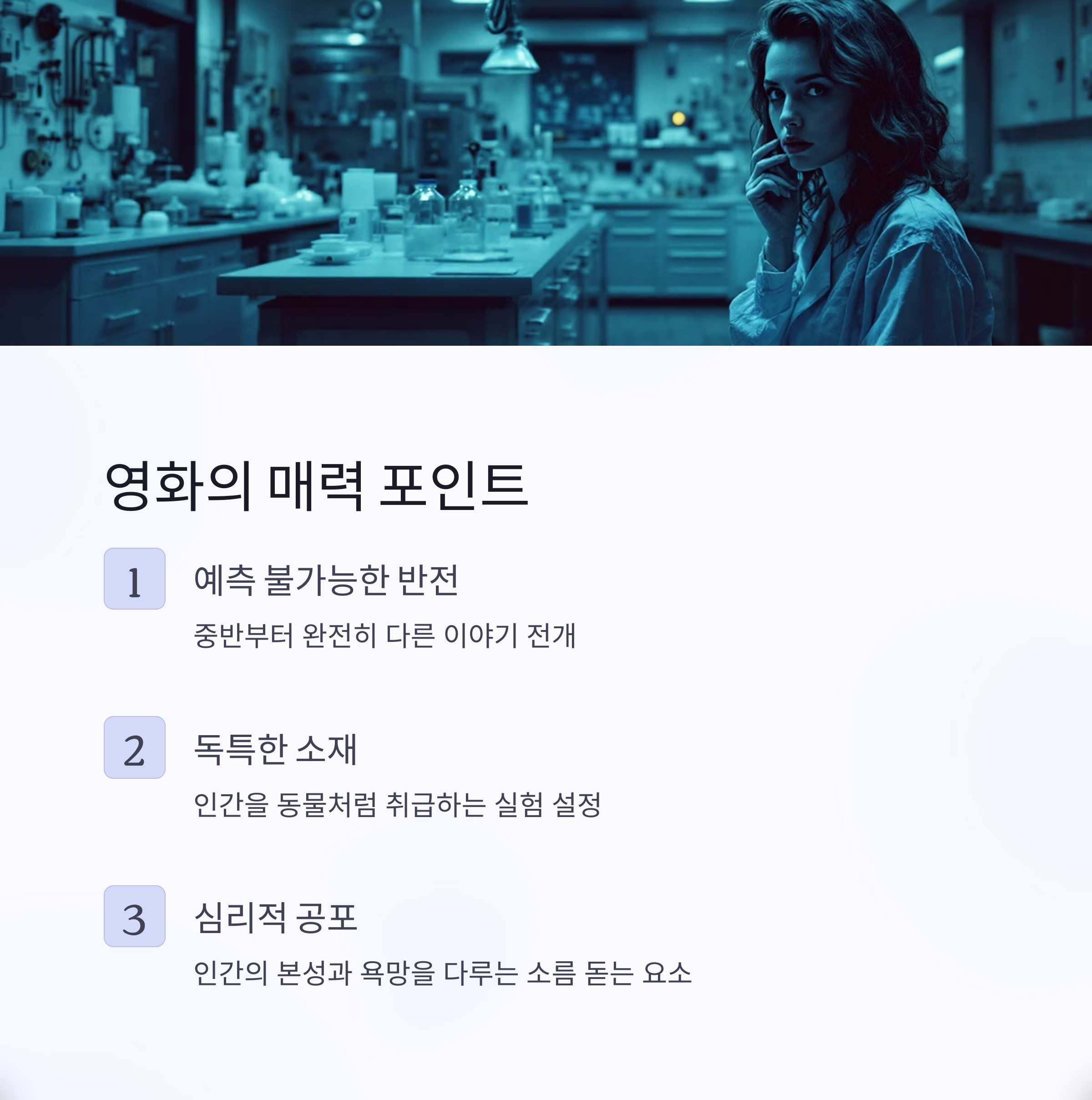 인간을 동물처럼 취급하는 실험이라는 소재 자체가 흥미로워요2. 이런 설정은 다른 영화에서 쉽게 볼 수 없는 독특함이 있어요.