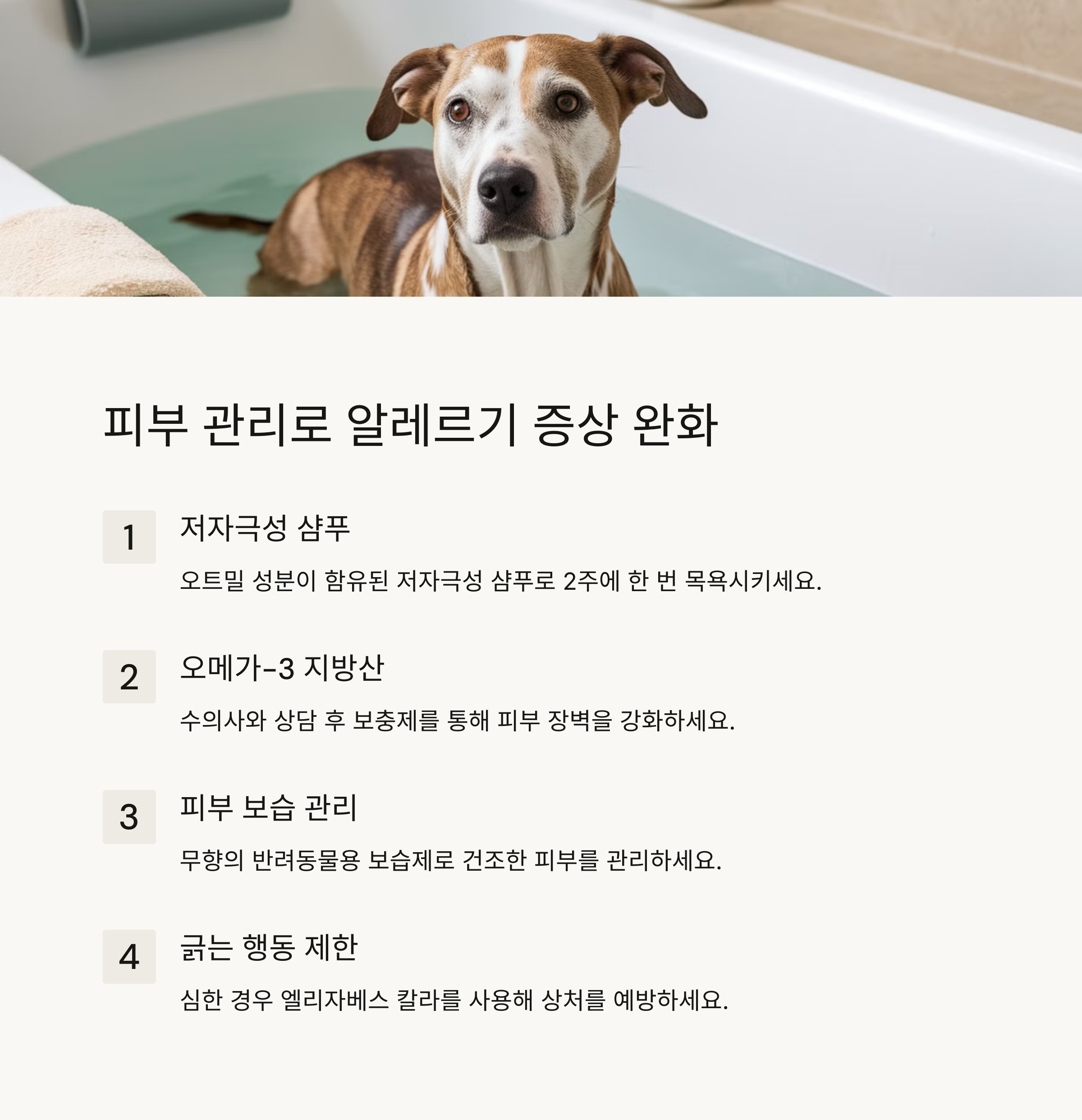 2주에 한 번 정도 저자극성 샴푸로 목욕을 시켜주면 피부에 붙어있는 알레르겐을 제거하는 데 도움이 돼요. 특히 오트밀 성분이 들어간 샴푸는 가려움증 완화에 좋더라구요.