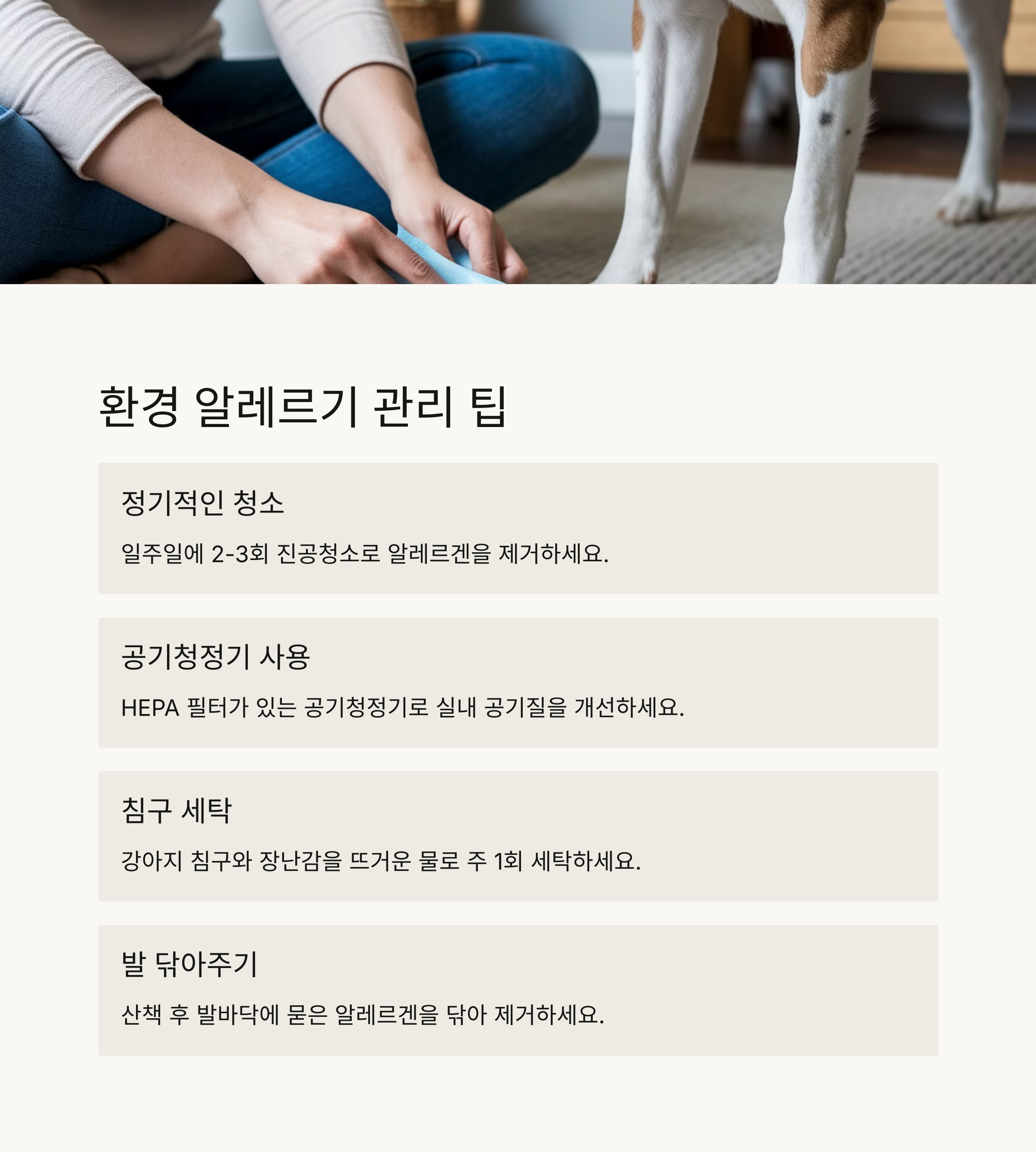 집먼지 진드기는 강아지 알레르기의 주요 원인 중 하나예요. 강아지 침구는 일주일에 한 번 60도 이상의 뜨거운 물로 세탁하고, 공기청정기를 사용하면 실내 알레르겐을 줄이는 데 도움이 돼요.