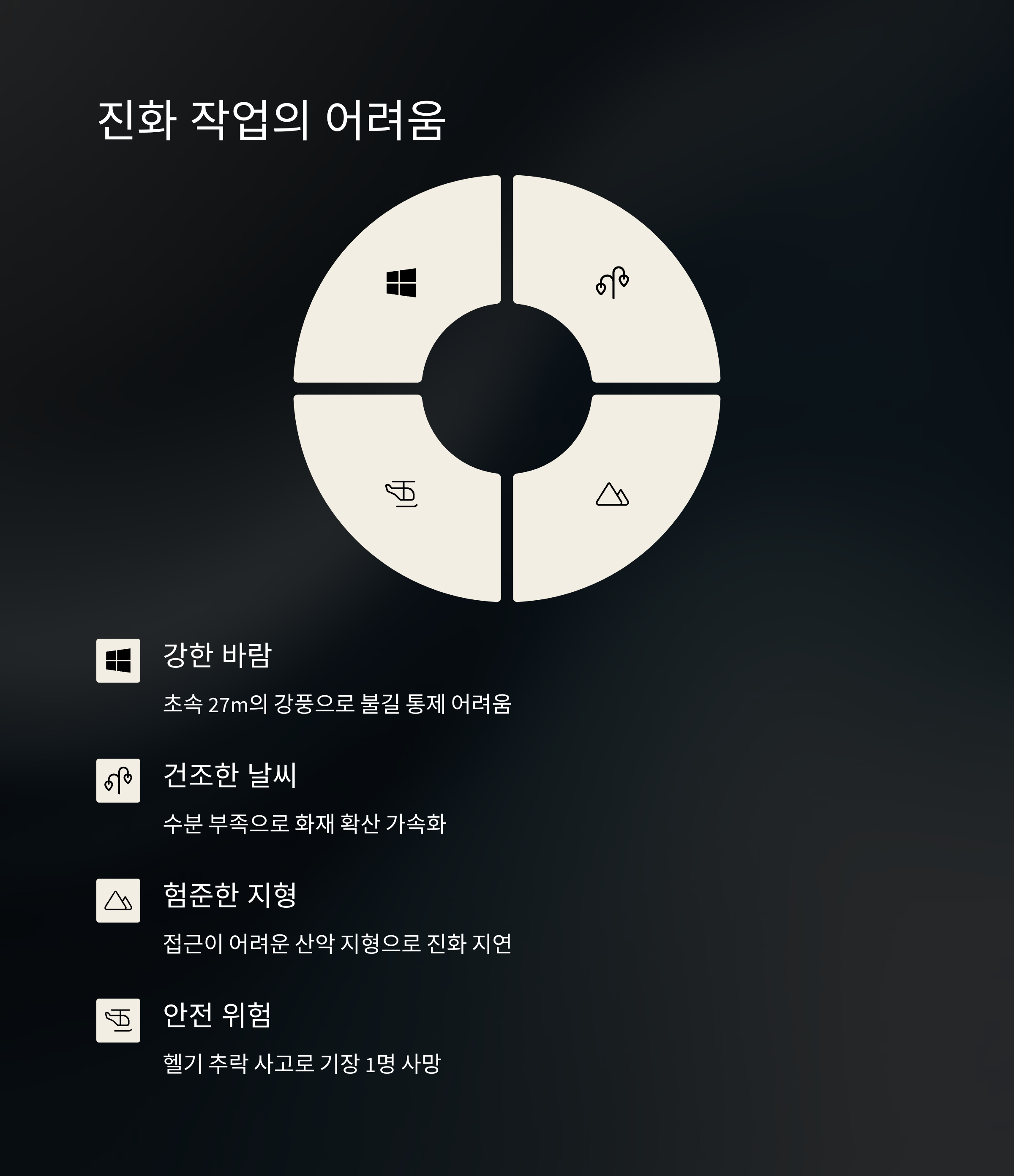- 비화 현상: 강풍으로 인해 불꽃이 날아가는 '비화(飛火) 현상'이 발생하여 상황을 더욱 악화시켰습니다