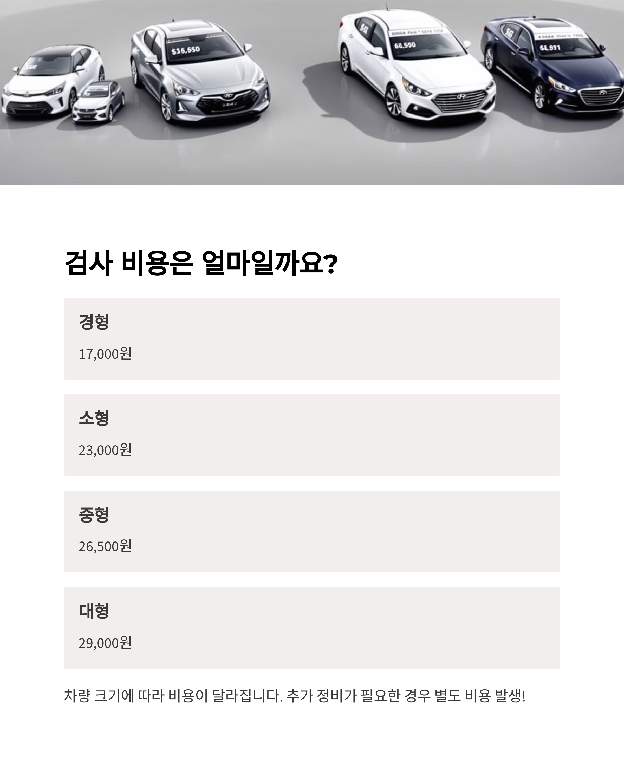 | 경형/소형 승용차 | 정기검사(배출가스 포함) | 35,000원~45,000원 |