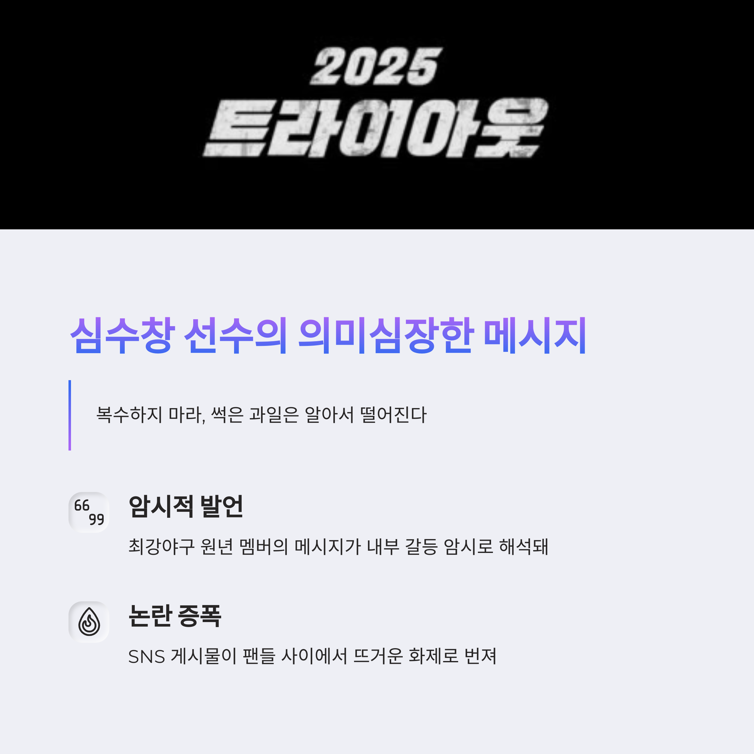 이런 갈등 속에서 최강야구 시즌1 원년 멤버였던 심수창 선수가 의미심장한 메시지를 남겨 더 큰 화제가 됐어요.