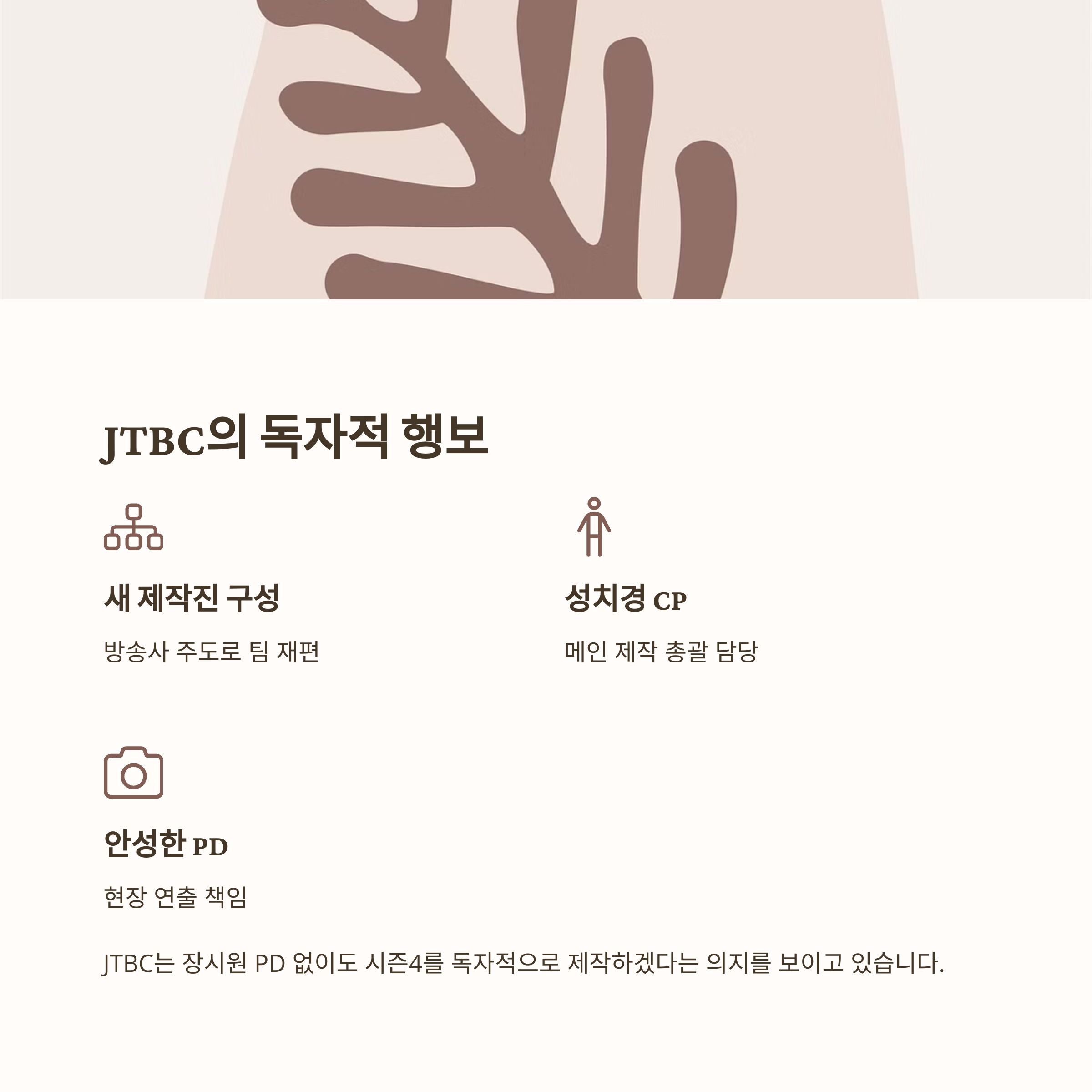 JTBC 측은 법적 절차도 준비 중이라고 밝히며, 더 이상 소모적인 입장 발표는 하지 않겠다는 입장을 전했습니다. 이에 따라 JTBC는 자체적으로 시즌4를 제작하기 위한 준비를 진행하고 있습니다.