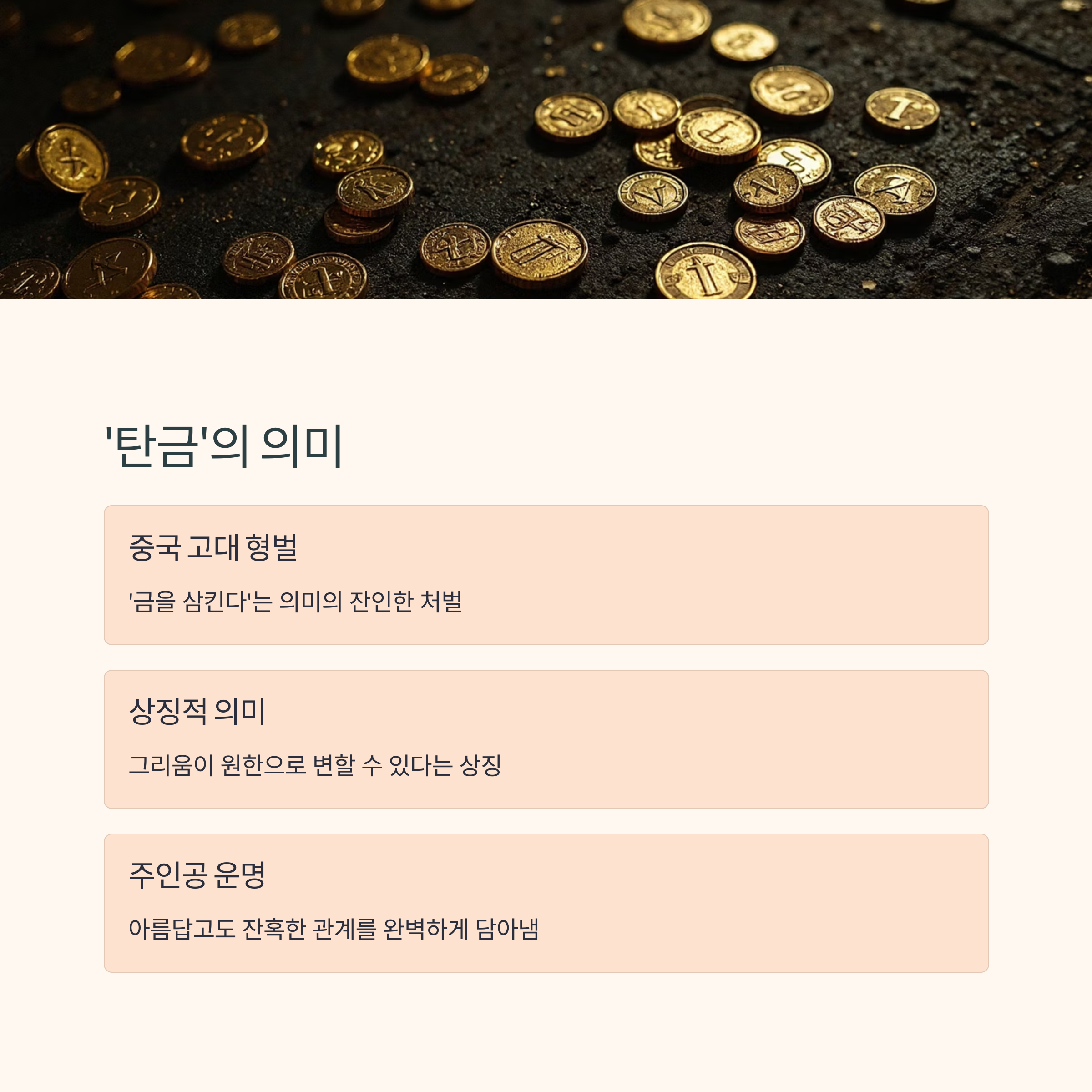 이 드라마의 제목이 '탄금'인 이유는 단순한 형벌 이상의 상징성을 담고 있기 때문이에요. 김홍선 감독은 "그리움이 원한으로 변할 수 있다는 상징"으로 이 제목을 선택했다고 해요. 제가 첫 에피소드를 보면서 느낀 건, 이 제목이 주인공들의 아름답고도 잔혹한 운명을 완벽하게 담아내고 있다는 거예요. 특히 홍랑과 재이의 관계가 발전할수록 이 제목의 의미가 더 깊어질 것 같아 기대됩니다!